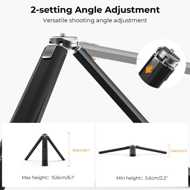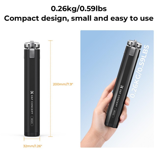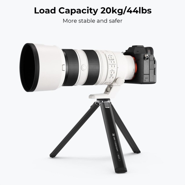 El K&F MS05 es un minitrípode metálico ligero y resistente para teléfonos y cámaras. Cuenta con un ajuste de altura de 2 posiciones, una rosca de 1/4" con una capacidad de carga de hasta 20 kg y un diseño antideslizante que garantiza una sujeción estable en cualquier situación fotográfica.