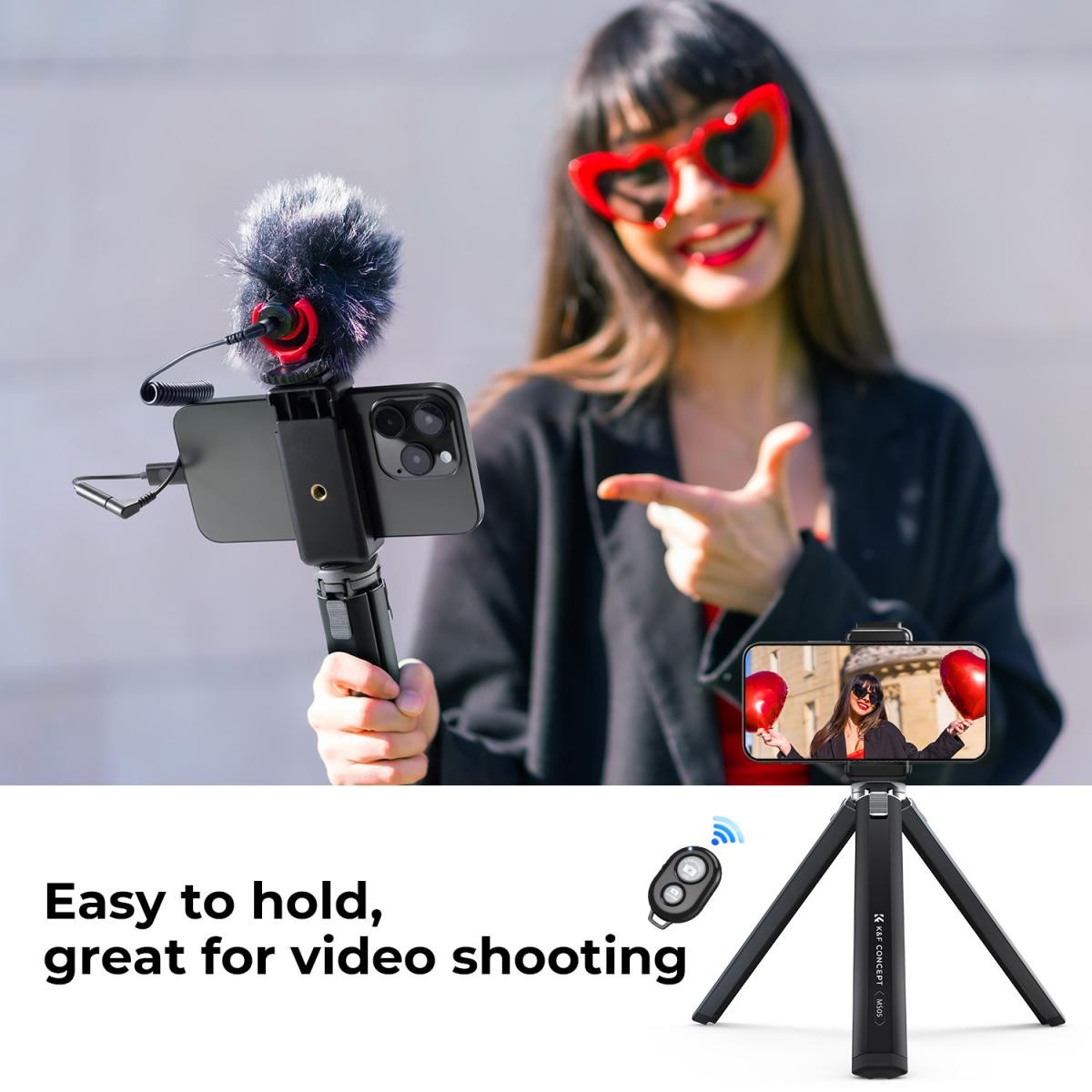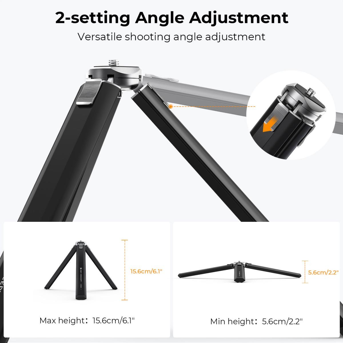 El K&F MS05 Metal Mini Phone Camera Tripod es un trípode resistente y versátil para creadores que viajan. Está fabricado en aleación de aluminio de alta calidad y ofrece una plataforma estable para tu cámara, teléfono móvil o estabilizador, lo que garantiza imágenes sin vibraciones. Una característica destacada es su impresionante capacidad de carga de hasta 20 kg, que supera con creces lo que se espera de un mini trípode, por lo que es adecuado para una amplia gama de equipos profesionales. El exclusivo ajuste de altura en 2 niveles, con una altura máxima de 105 mm, permite adaptarse rápida y fácilmente a las diferentes necesidades fotográficas. A pesar de su solidez, el trípode es increíblemente ligero y portátil, con unas dimensiones plegadas de tan solo 130 mm (5,1 pulgadas) y un peso de solo 169 g. Se puede plegar fácilmente y guardar en una bolsa, lo que lo hace ideal para viajar y fotografiar en exteriores. La parte superior está equipada con una interfaz de rosca universal de 1/4" para una amplia compatibilidad, y la parte inferior cuenta con almohadillas de silicona antideslizantes para un apoyo más estable en cualquier superficie. El kit incluye un soporte para el teléfono móvil y un mando a distancia inalámbrico para mayor comodidad.