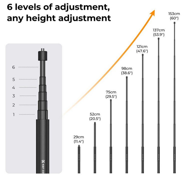 El K&F MS07 es un palo extensible universal de 60 pulgadas (152 cm) de longitud extra, ideal para capturar fácilmente fotos panorámicas y primeros planos de objetos lejanos. Este palo selfie está diseñado tanto para fotógrafos profesionales como para aficionados y garantiza que tu espacio para fotografiar ya no tenga límites. Su estructura de aleación de aluminio de alta calidad garantiza su resistencia, mientras que el conector de 1/4 de pulgada de la base permite un montaje sencillo en un trípode. El diseño del tubo extensible proporciona un soporte firme y estabilidad, y el mango de silicona garantiza un agarre cómodo durante su uso.