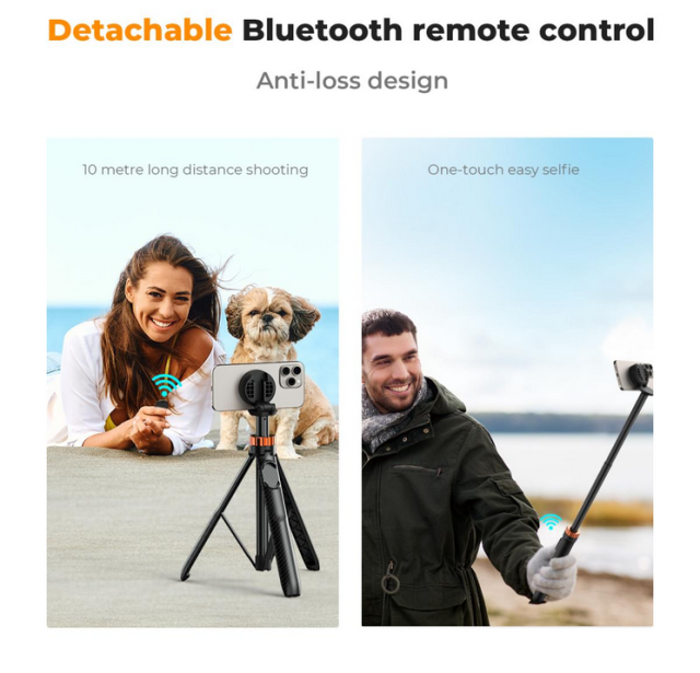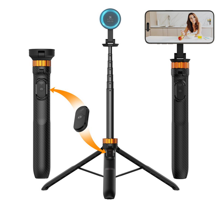 El trípode para teléfonos K&F MS19 ofrece una versatilidad excepcional en cuanto a altura, con una extensión máxima de 162 cm y un ajuste de las patas en 7 secciones, lo que permite configurar la altura ideal para cualquier toma. El trípode está diseñado para un uso cómodo y cuenta con una estructura de instalación magnética, gracias a la cual la conexión entre el trípode, el palo selfie y el teléfono móvil es rápida y sin complicaciones. Este trípode es compatible con una amplia gama de dispositivos, incluidos los modelos de iPhone desde el 12 mini hasta el último 15 Pro Max. El soporte magnético garantiza una cobertura completa de las tomas, por lo que es ideal para capturar paisajes, retratos o escenas deportivas. El trípode, que integra un control remoto Bluetooth, facilita la captura fluida de selfies y fotos durante los viajes, y cuenta con un control de un solo botón y un diseño seguro contra pérdidas, con una autonomía de hasta 10 horas de funcionamiento continuo. La estructura reforzada del trípode y las almohadillas de silicona antideslizantes en la base aumentan la estabilidad, mientras que los anillos de goma integrados en el tubo de las patas, que amortiguan los golpes, garantizan una mayor resistencia y estabilidad.