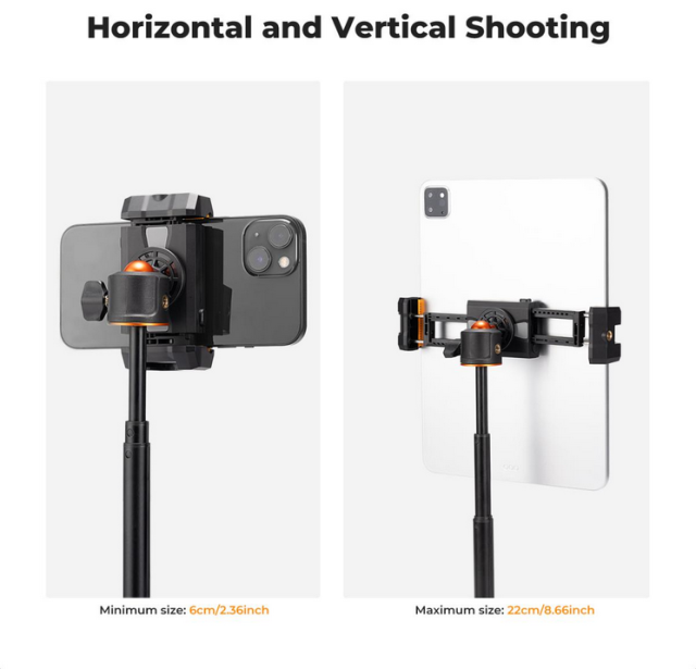 El K&F MS20 es un soporte versátil 2 en 1 para teléfonos y tabletas, diseñado para ofrecer comodidad y flexibilidad. Permite fijar de forma segura tanto el teléfono móvil como la tableta al mismo tiempo, lo que facilita el ajuste de la configuración con un solo clic y un movimiento. El soporte está equipado con una interfaz de zapata fría para conectar diversos accesorios fotográficos, como micrófonos y luces de relleno. Gracias a su anchura ajustable entre 6 y 22 cm y a varios orificios de 1/4" para tornillos que permiten acoplar un trípode o un dispositivo, ofrece un soporte robusto y gran adaptabilidad. Su diseño compacto, su estructura ligera y su base hueca garantizan un almacenamiento sencillo, compatibilidad con la carga y protección del dispositivo.