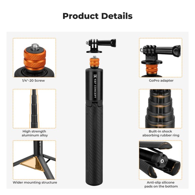 K&F Concept: palo selfie invisible, palo extensible largo (120 cm/47,2 pulgadas) para cámaras deportivas Insta360, GoPro y DJI Action; monopié extensible de 1/4" con adaptador GoPro.