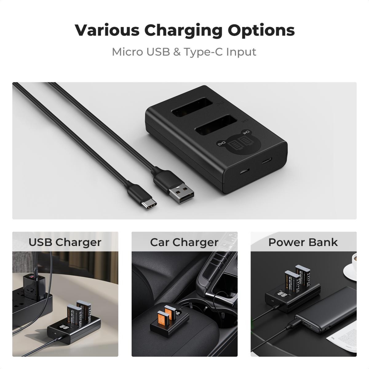 K&F Concept: pack de 2 baterías NB-13L y cargador de doble ranura para Canon EOS G7 X Mark II, G7 X, G1 X Mark III, G5 X, G5X Mark II, G9 X, G9 X Mark II, SX620 HS y SX720 HS. La pantalla LCD inteligente del cargador muestra claramente la capacidad de la batería, lo que le permite conocer rápidamente el estado de carga. Tensión de entrada: 1,5 A; salida: 5 V 2,1 A; 8,4 V 700 mAh (1 batería), 8,4 V 500 mAh (2 baterías).
