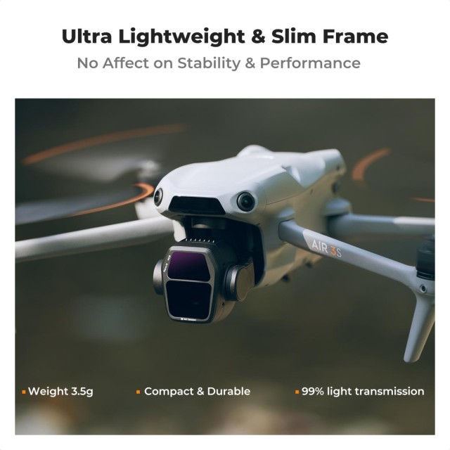 El juego de filtros ND de K&F Concept, diseñado específicamente para el sistema de doble cámara del DJI Air 3S, incluye filtros ND8, ND16, ND32 y ND64 que ayudan a reducir los distintos niveles de luz entre 3 y 6 pasos, controlar con precisión la velocidad de obturación, ajustar correctamente la exposición en diversas condiciones de iluminación y crear tomas fluidas. Este filtro K&F Concept Air 3S está fabricado con cristal óptico AGC de primera calidad, con 28 capas nanométricas multifuncionales en ambos lados que ayudan a capturar colores vivos y obtener imágenes impresionantes; además, las capas protegen los filtros contra el desgaste y los arañazos, el polvo y la suciedad, y repelen el agua.