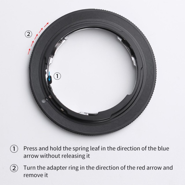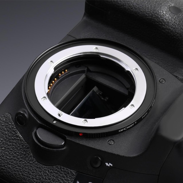 Aunque el objetivo encaja físicamente, ni el diafragma automático, ni el enfoque automático, ni ninguna otra función funcionarán al utilizar este adaptador. El anillo del adaptador no tiene contactos eléctricos. El funcionamiento totalmente manual, el enfoque manual y el ajuste manual del diafragma se pueden lograr con la exposición manual del cuerpo y la prioridad de diafragma. En este caso, será necesario utilizar el «modo de reducción de apertura» durante la medición, ya que el objetivo no permite el control de la apertura desde el cuerpo de la cámara. Puede fotografiar en modo manual o en modo de prioridad de apertura. Antes de utilizarlo, configure la cámara en el menú: «Fotografiar sin objetivo».