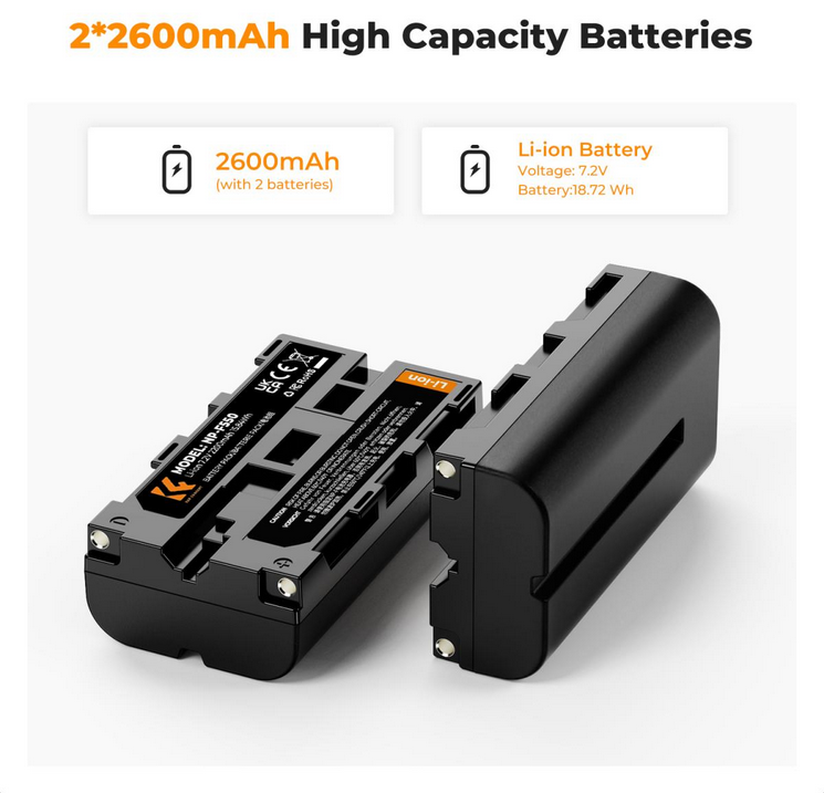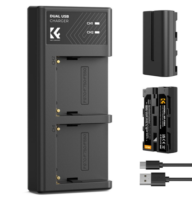 El kit de baterías duales K&F NP-F550 incluye dos baterías de repuesto de alta capacidad (2200 mAh) y un cargador de dos canales, que garantizan una mayor autonomía para las videocámaras Sony y los dispositivos compatibles.