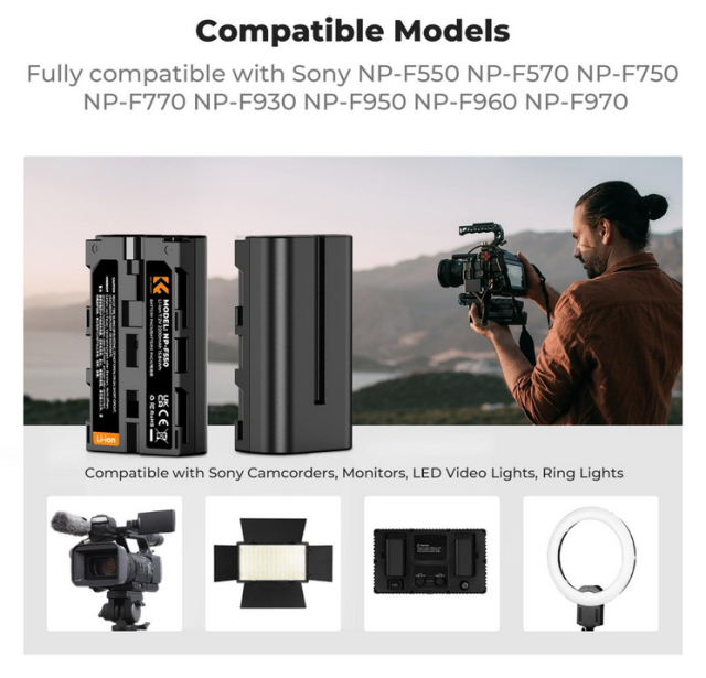 • Amplia compatibilidad: Estas baterías son compatibles con una amplia gama de videocámaras y dispositivos Sony que utilizan baterías NP-F550, F570, F750, F770, F930, F950, F960 y F970, por lo que resultan versátiles para diversos entornos.