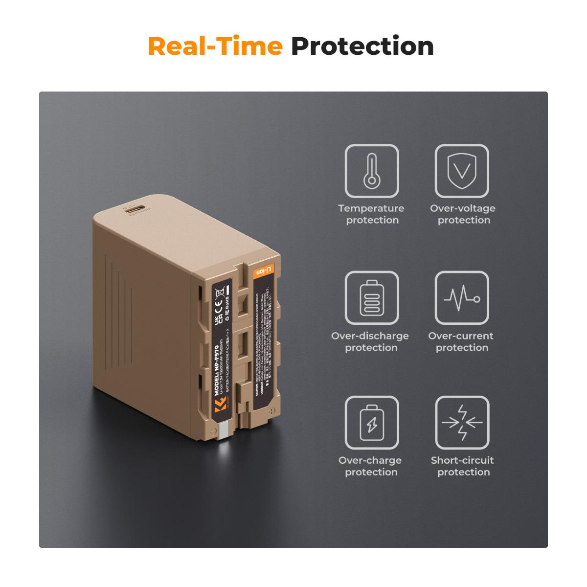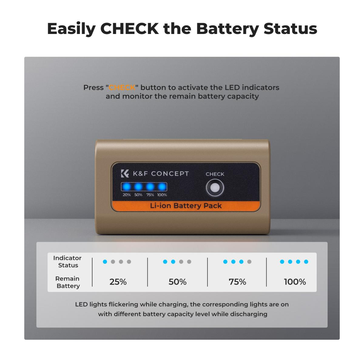 Esta batería NP-F970 cuenta con un puerto de carga USB tipo C de alta potencia (PD3.0/20 W), cuya carga completa dura solo 4,8 horas, lo que reduce el tiempo de carga en un 40 % en comparación con la carga convencional. Los niveles de carga de la batería son 25 %, 50 %, 75 % y 100 %. Basta con pulsar el botón «CHECK» para activar los indicadores y comprobar el estado de la batería.