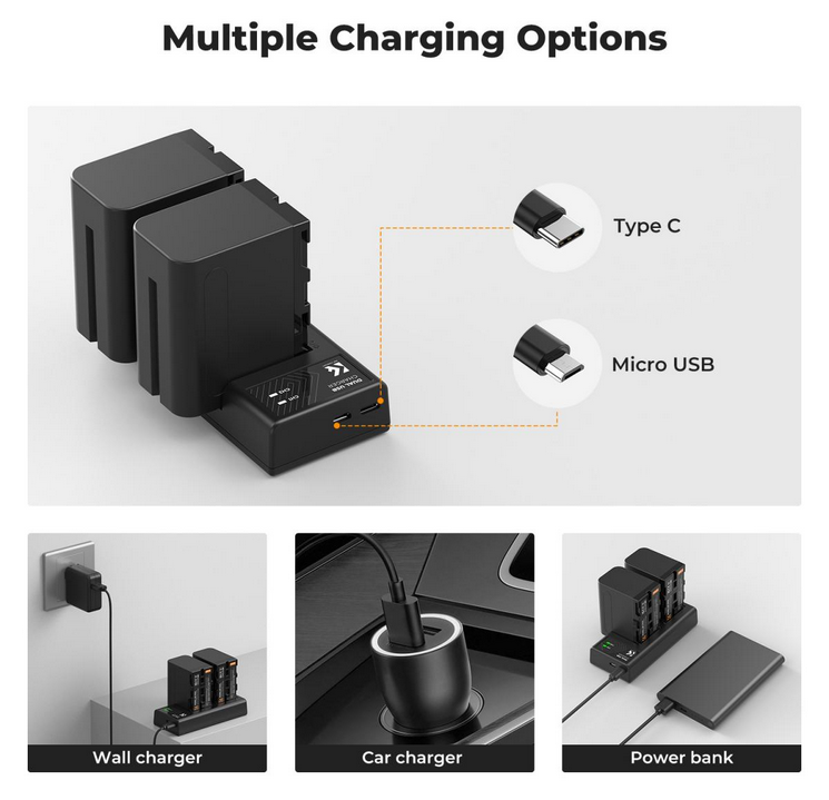 Más formas de carga: El cargador de dos ranuras admite una entrada Micro-USB (5 V / 2,1 A), lo que permite una carga flexible y cómoda mediante cargadores de red, cargadores para coche o cargadores portátiles.