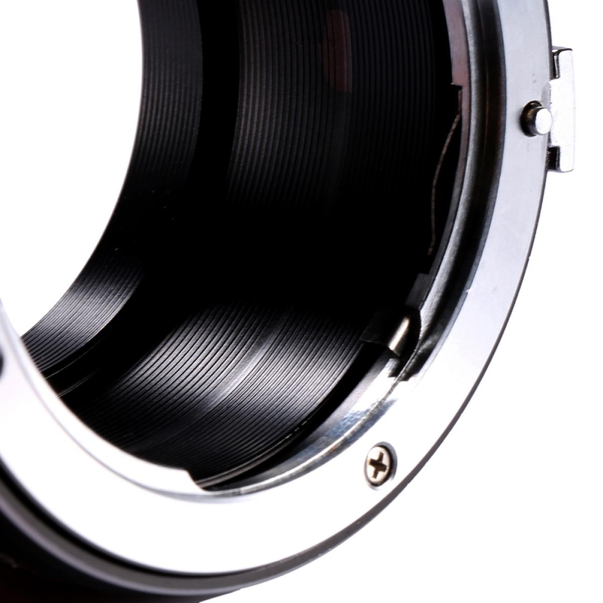 El adaptador está fabricado con una combinación de latón y aluminio, lo que garantiza una gran durabilidad, una sujeción firme y un montaje y desmontaje fluidos. Dado que no hay comunicación electrónica entre la cámara y el objetivo, el enfoque y el ajuste de la apertura se realizan manualmente. El enfoque al infinito es totalmente compatible.
