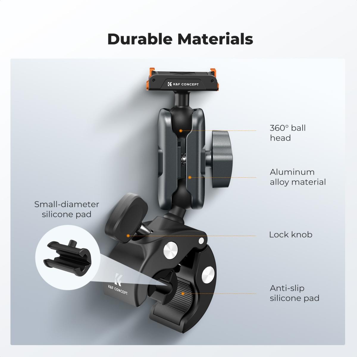 Este soporte de sujeción rápida de K&F Concept sirve para fijar accesorios. Se puede utilizar, por ejemplo, como clip para el manillar de una bicicleta o una motocicleta.