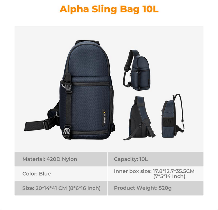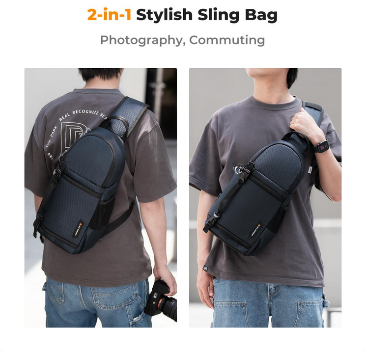 La bolsa para cámara K&F Urban Wander 02 10L (azul) es una bolsa de pecho resistente y versátil con espacio suficiente para el equipo fotográfico, los accesorios y los objetos personales. Está diseñada pensando en la seguridad y la comodidad, y es ideal para los amantes de las cámaras réflex digitales, las cámaras réflex y las cámaras sin espejo.