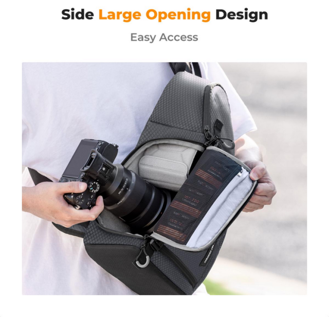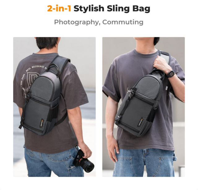 La bolsa K&F Urban Wander 02 Sling Bag, con una capacidad de 10 litros, es una bolsa para cámara diseñada con esmero que combina estilo, practicidad y protección. Con unas dimensiones de 16 x 8 x 6 pulgadas, ofrece suficiente espacio de almacenamiento sin renunciar a una forma elegante y compacta. La bolsa cuenta con varios compartimentos que permiten guardar de forma segura la cámara, los objetivos, el trípode, los accesorios y los objetos personales.