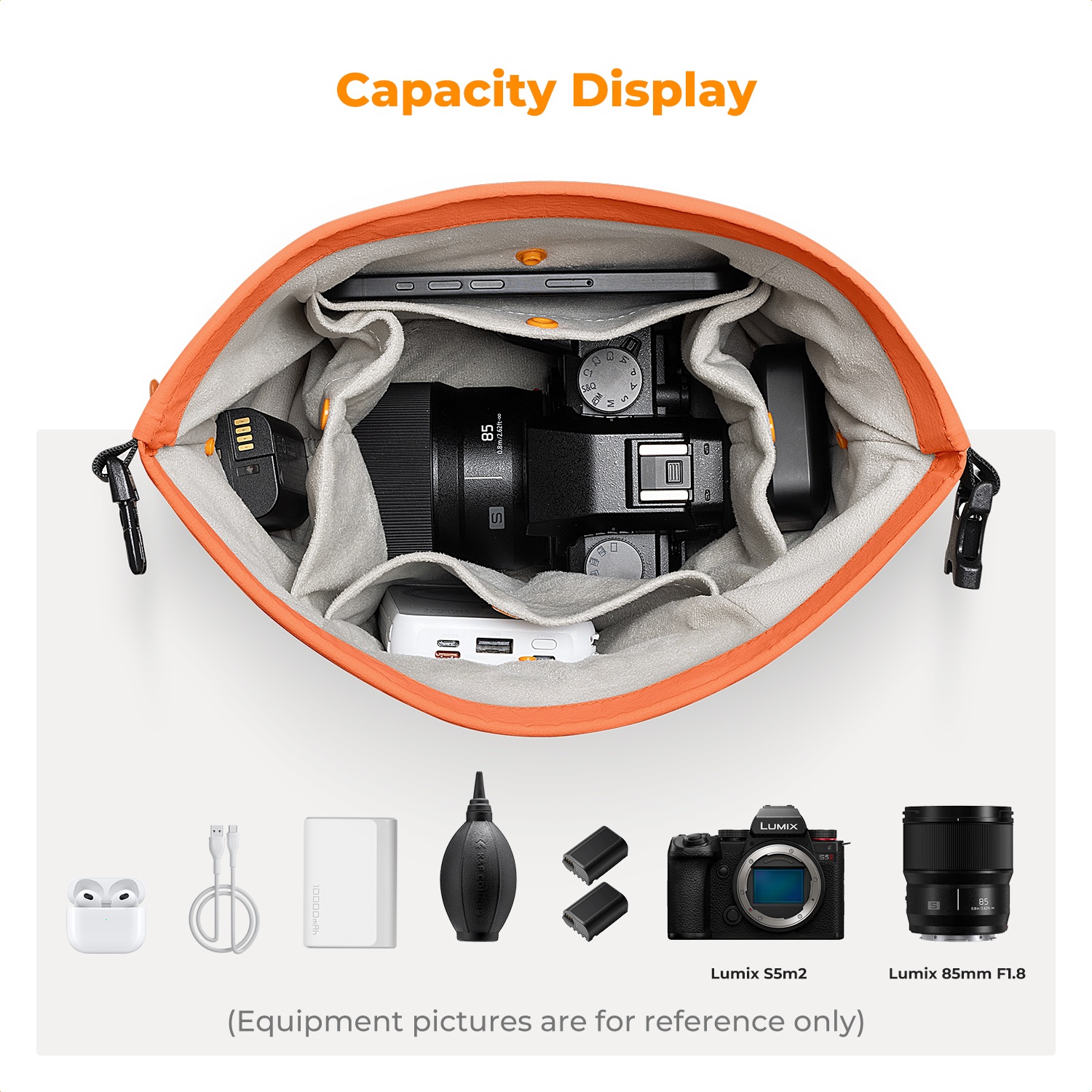 La bolsa K&F Sling Bag 5L Urban Wander 11 (naranja) está pensada para fotógrafos que viajan y necesitan una solución compacta y funcional para guardar su equipo fotográfico. Con una capacidad de 5 l, tiene espacio suficiente para una cámara y un objetivo, y se puede llevar como bandolera, bolso cruzado, bolso de mano o como forro interior. Su diseño moderno incluye un cierre enrollable seguro que proporciona una protección adicional al equipo y, al mismo tiempo, ofrece un fácil acceso.