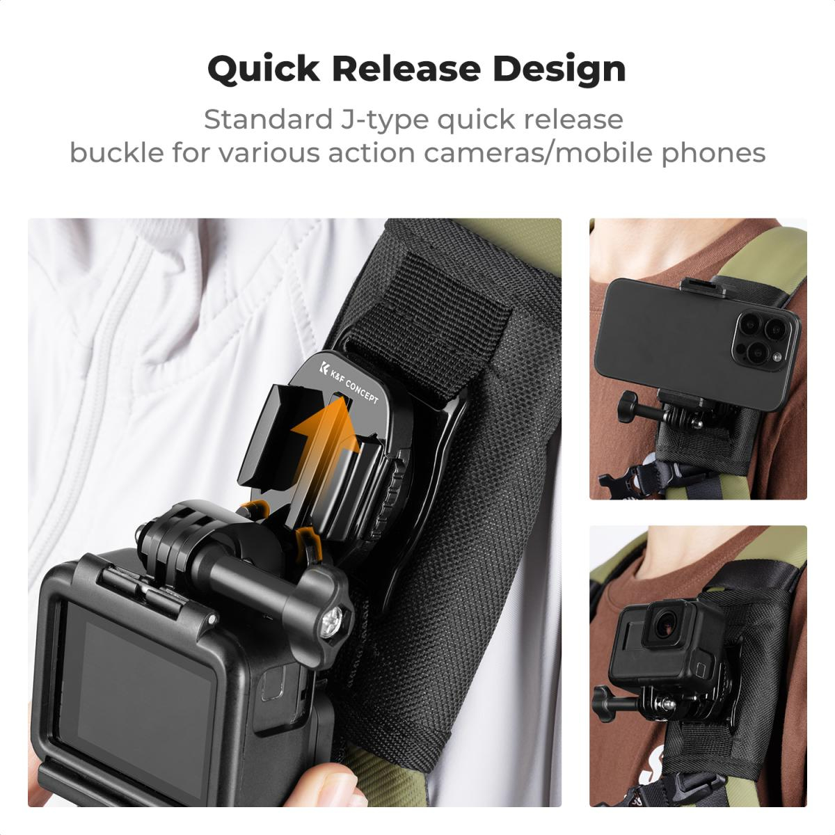 Soporte para correa de hombro y mochila K&F Concept, compatible con GoPro Hero 13/12/11/10/9/8/7/6/5/4 Black, Session, apto para DJI Osmo Action 5 Pro/4/3 y otras cámaras de acción, con rotación de 360°. El soporte cuenta con una base giratoria de 360°, lo que ofrece diversos ángulos de grabación y permite girar la cámara para crear la toma perfecta. Instala la cámara de acción, colócala en la base del soporte, fíjala a la correa para el hombro y gira para ajustar el ángulo y capturar perspectivas únicas; diseño con clip de sujeción rápida, fácil cambio de dispositivo.