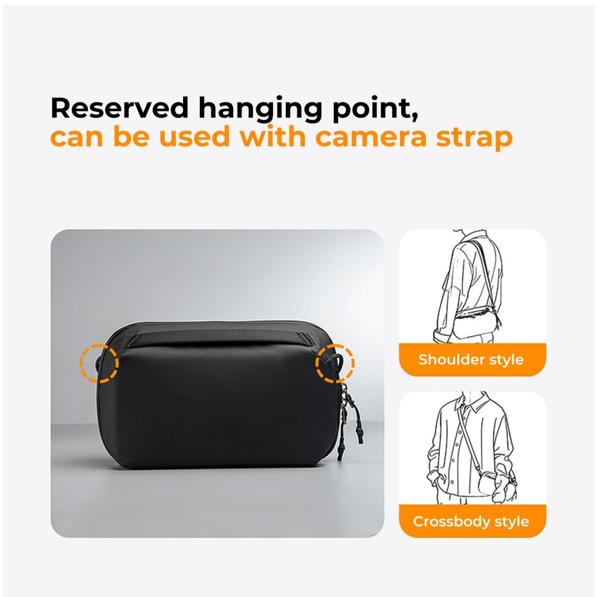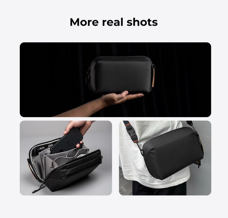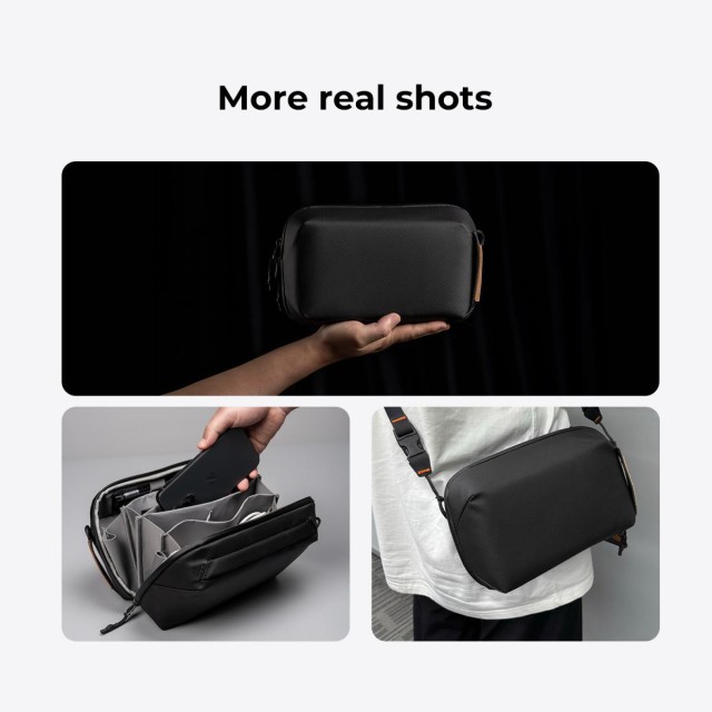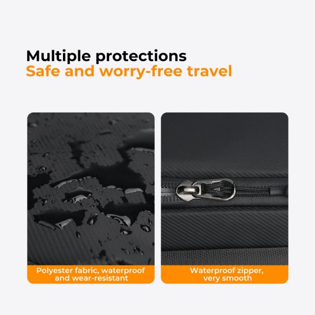 Está fabricada con un material recubierto resistente al agua y cuenta con cremalleras impermeables que protegen de forma fiable contra las salpicaduras y garantizan que tus accesorios permanezcan a salvo en diversas condiciones climáticas. El suave forro interior y el diseño seguro proporcionan una protección adicional y protegen tus accesorios digitales contra golpes y aplastamientos.