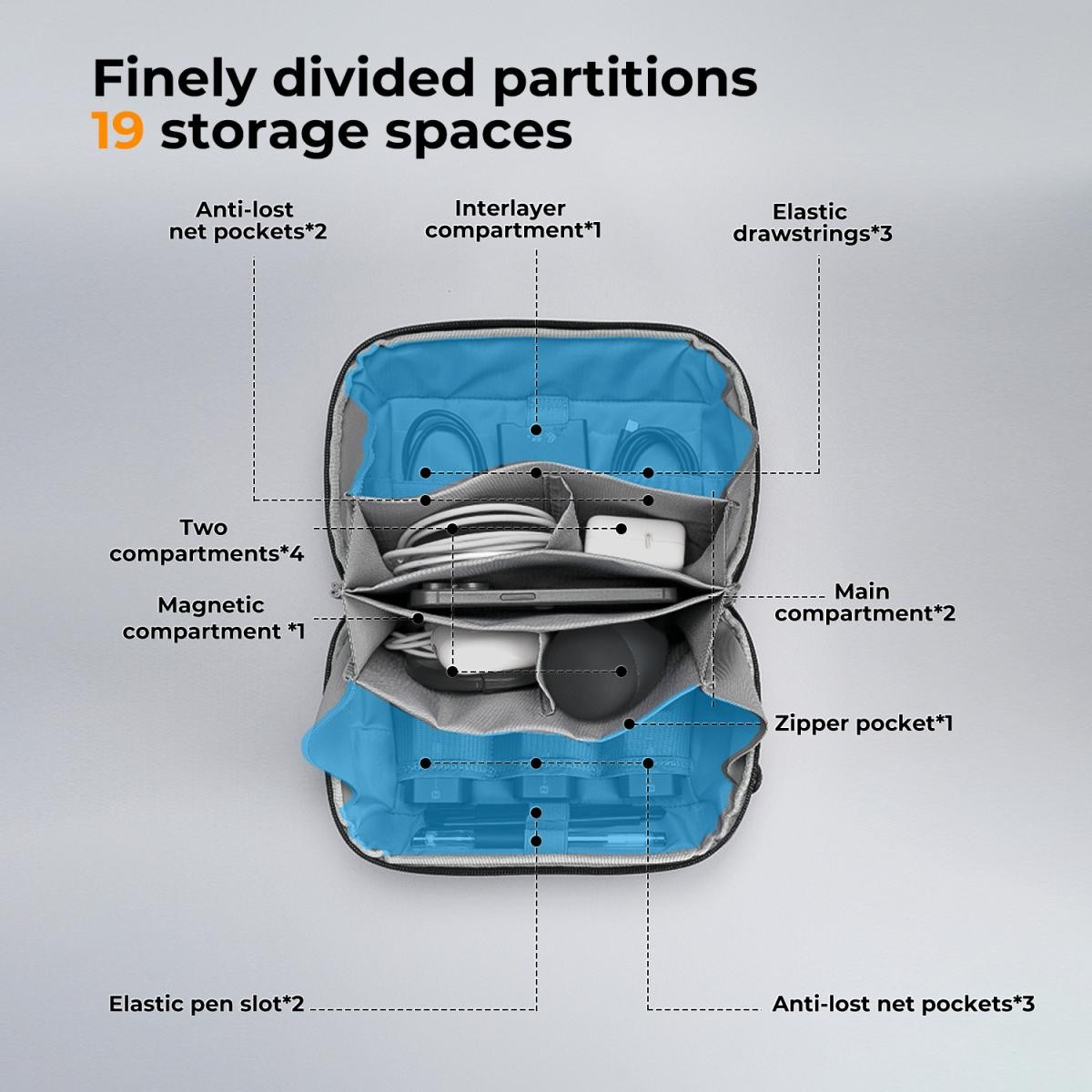 • Compartimentos: 19 bolsillos de almacenamiento