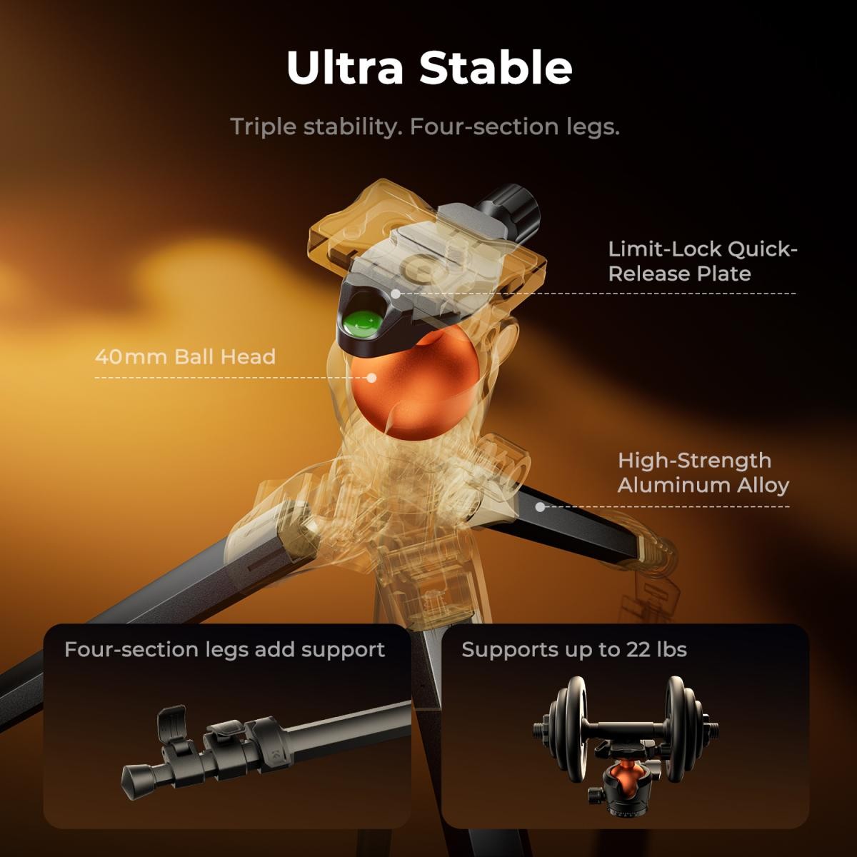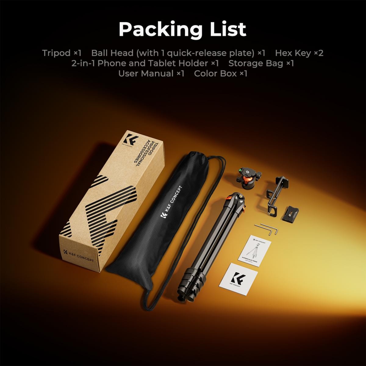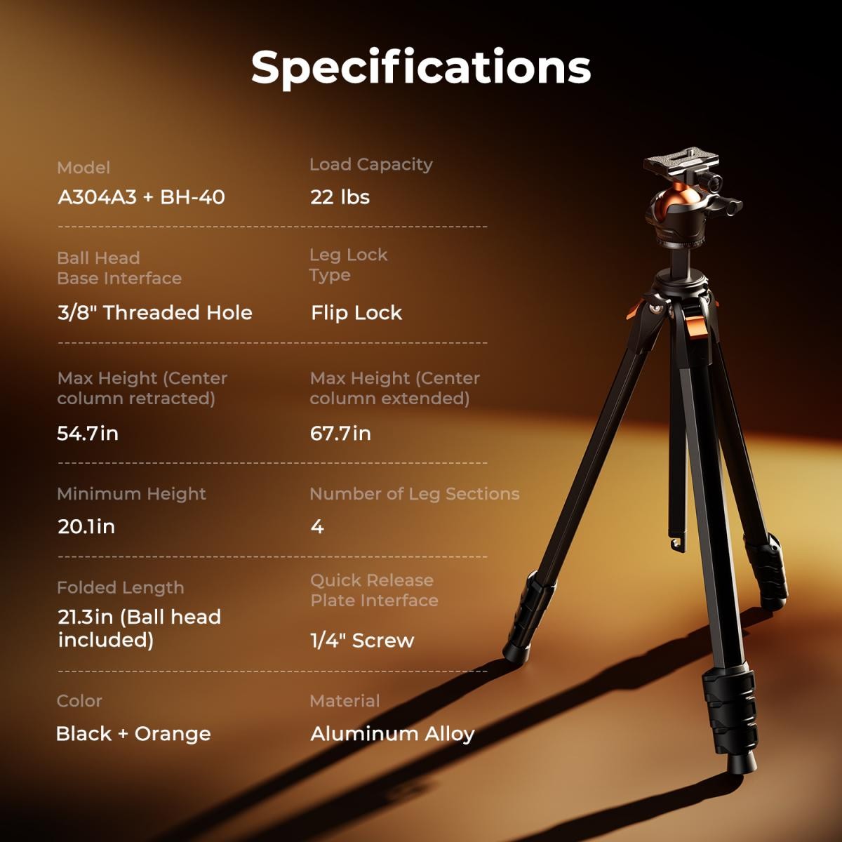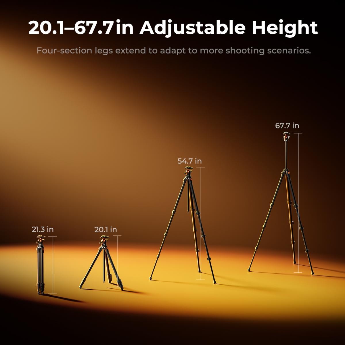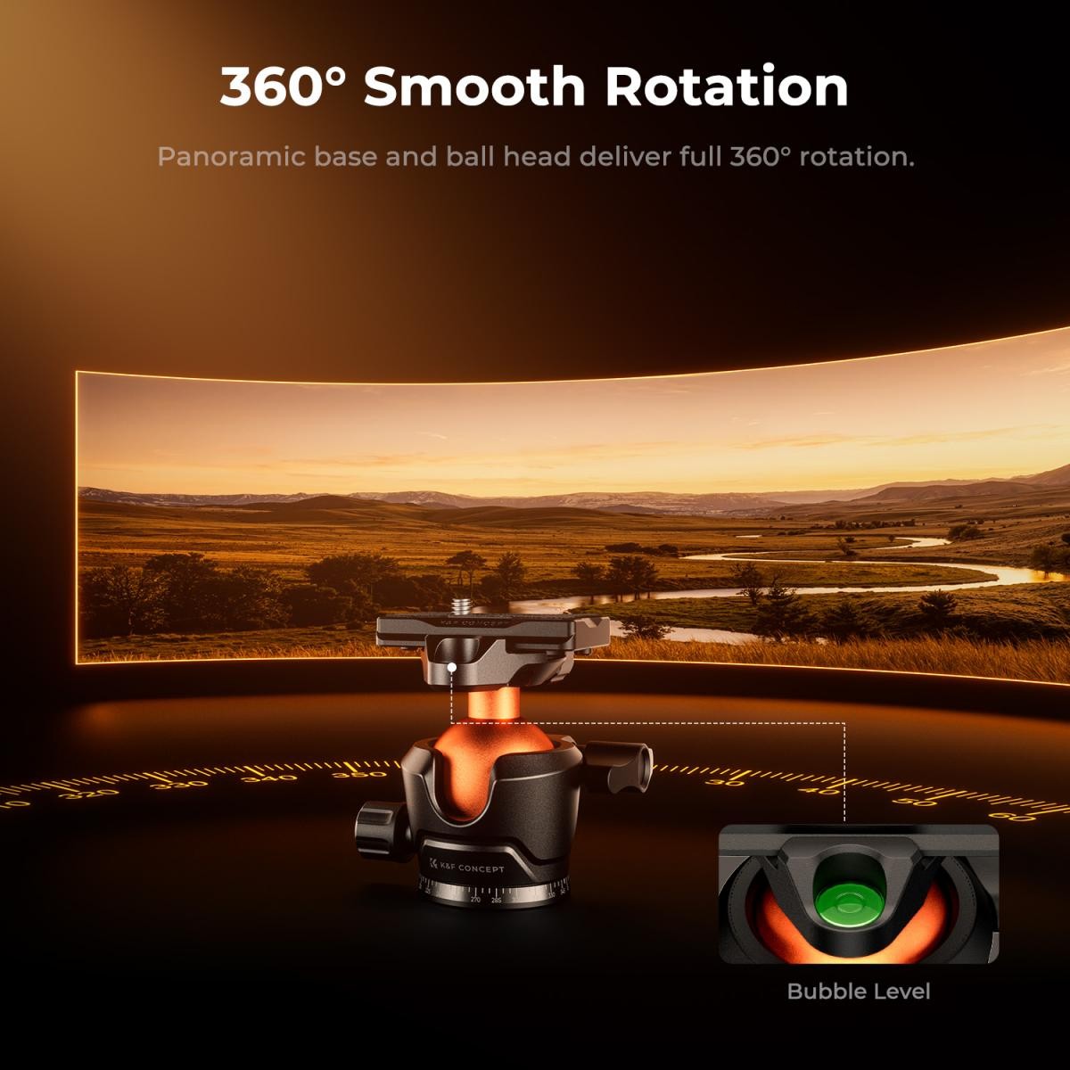 El trípode K&F A304A3+BH-40 es un trípode de viaje de aluminio para cámaras de 172 cm (67") con rótula esférica, compatible con el sistema Arca. El trípode es compacto, ligero y portátil, ideal para cámaras DSLR, cámaras sin espejo, prismáticos, iPhone o teleprompter.