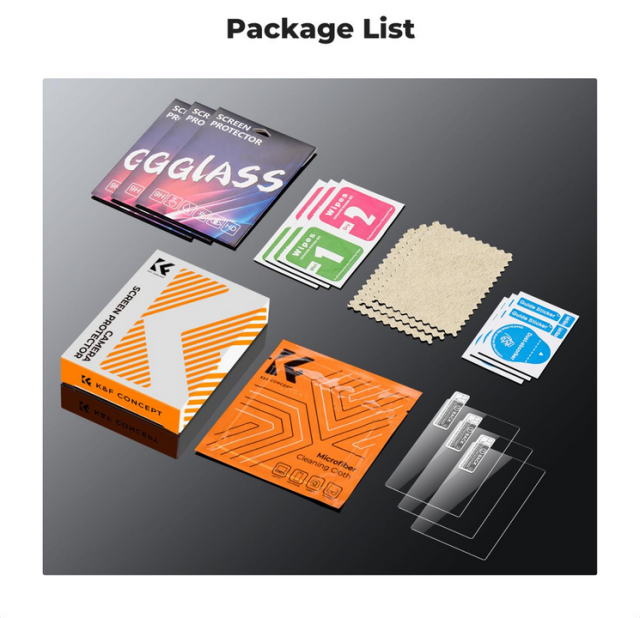 El juego de protectores de pantalla para cámaras K&F incluye 3 protectores de cristal templado y un paño de limpieza al vacío, diseñados específicamente para las cámaras Canon G9X II, G9X, G7X III, G7X II, G7X, G5X II y G5X. Estos protectores ofrecen una dureza de 9H, una claridad cristalina y una fácil instalación sin burbujas.