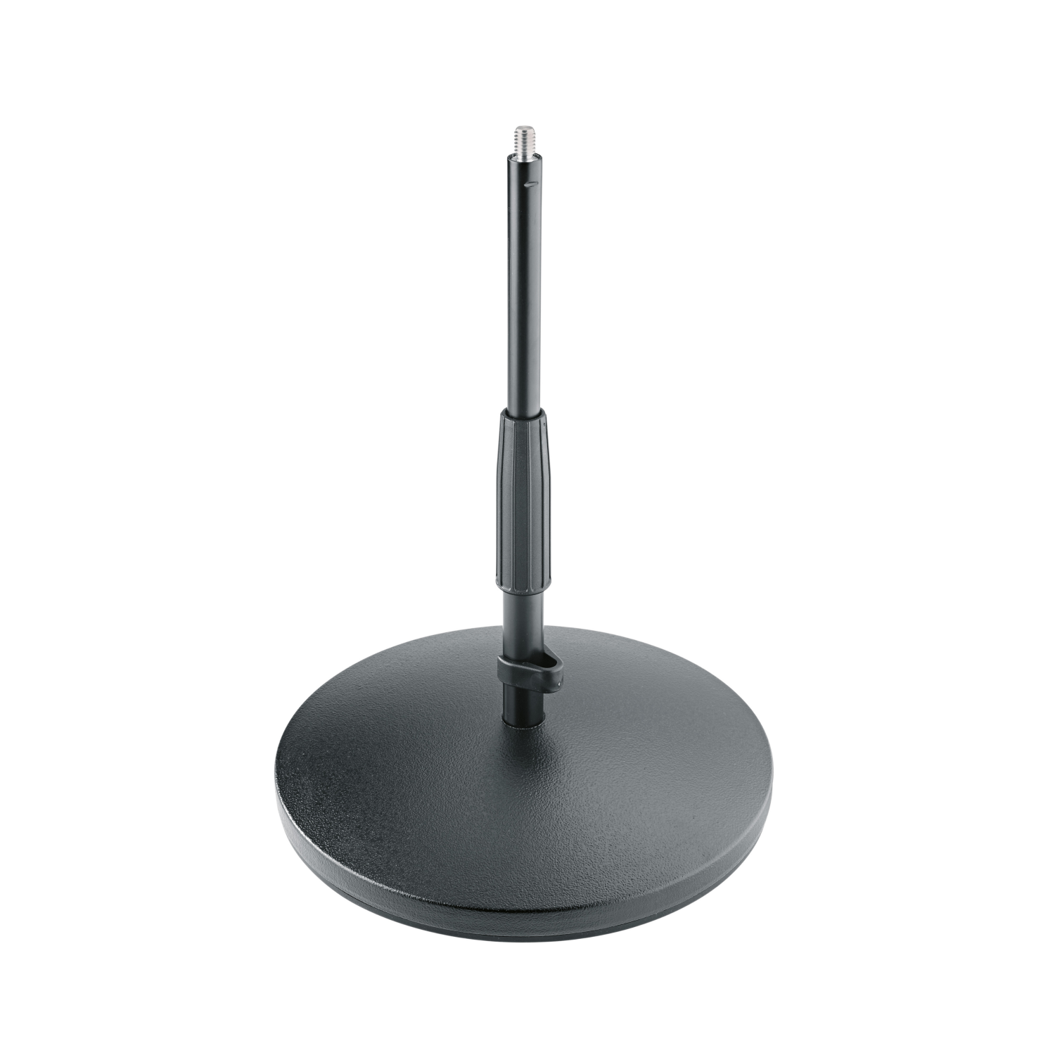 Soporte bajo con una base de hierro fundido pesada para una estabilidad máxima. El anillo circular de goma amortigua los ruidos de los pasos y reduce la transmisión de sonidos no deseados. Elegante empalme ajustable para regular fácilmente la altura.
