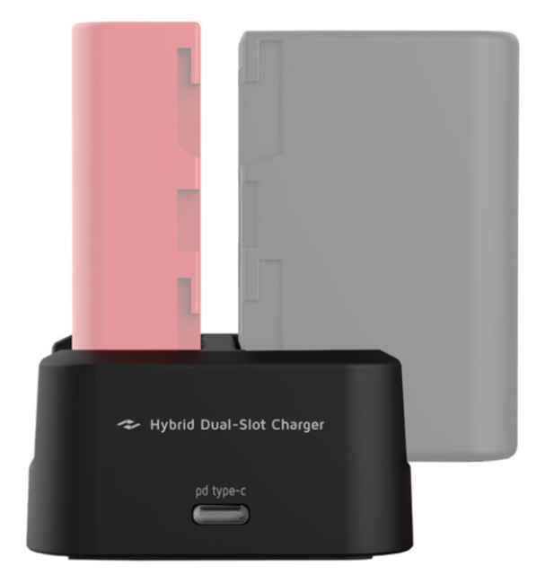 El cargador híbrido dual Kinefinity PD (A410-100-01) carga simultáneamente dos baterías GripBAT 2S de la serie L o 4S BP-U30, incluso de diferentes tipos. Admite carga rápida PD de 60 W+ (adaptador recomendado de 65 W), con indicadores LED y entrada USB-C para una gestión de la alimentación eficaz y portátil.