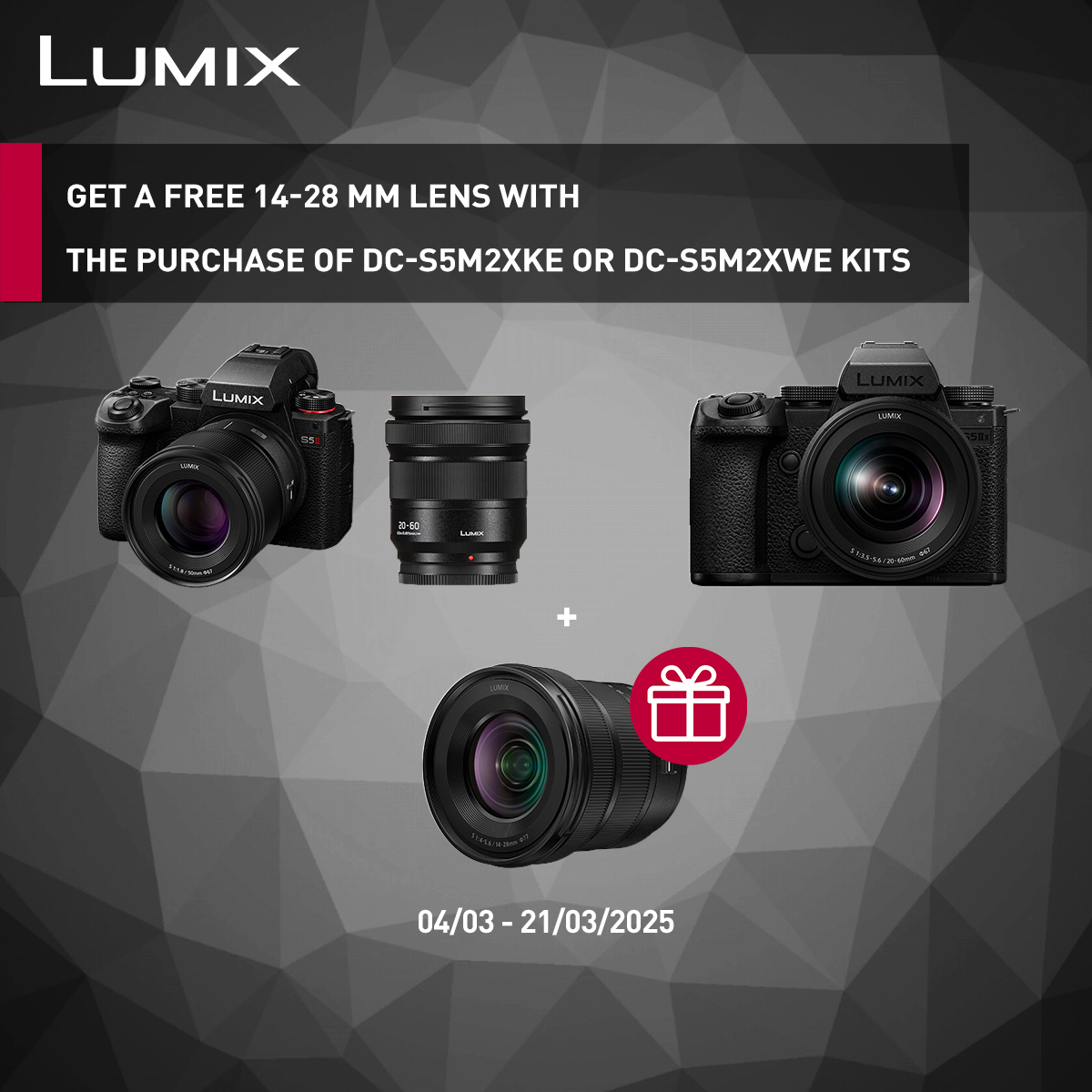 ¡Aprovecha la nueva y ventajosa promoción de Panasonic y llévate gratis el objetivo Panasonic LUMIX S 14-28 mm f/4-5,6 Macro (Bulk) al comprar los kits LUMIX DC-S5M2XKE o DC-S5M2XWE! Este fantástico regalo te permitirá ampliar tus posibilidades fotográficas y disfrutar de imágenes de alta calidad. La promoción es válida del 4 al 21 de marzo de 2025, y solo se aplica a la compra de los kits mencionados. La promoción no es acumulable con ninguna otra oferta.