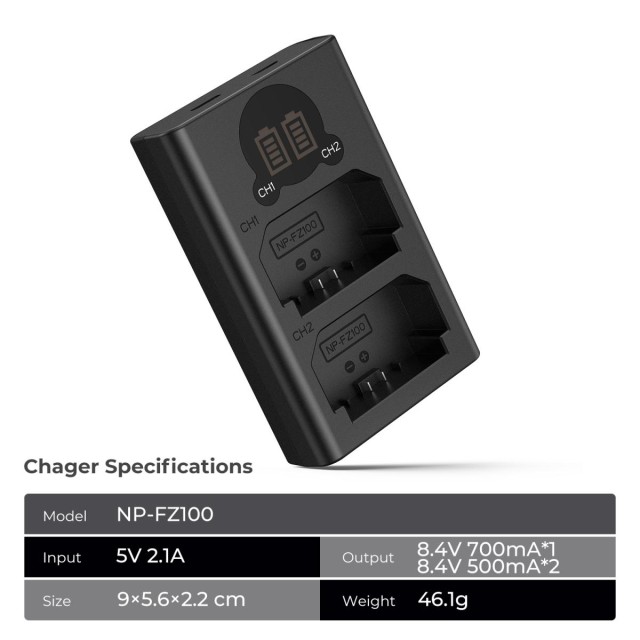 - * Cargador con dos ranuras. El cargador rápido de baterías NP-FZ100 está equipado con una interfaz dual micro-USB y Type-C, lo que aumenta la comodidad de uso. Nota: El paquete solo incluye el cable Type-C.