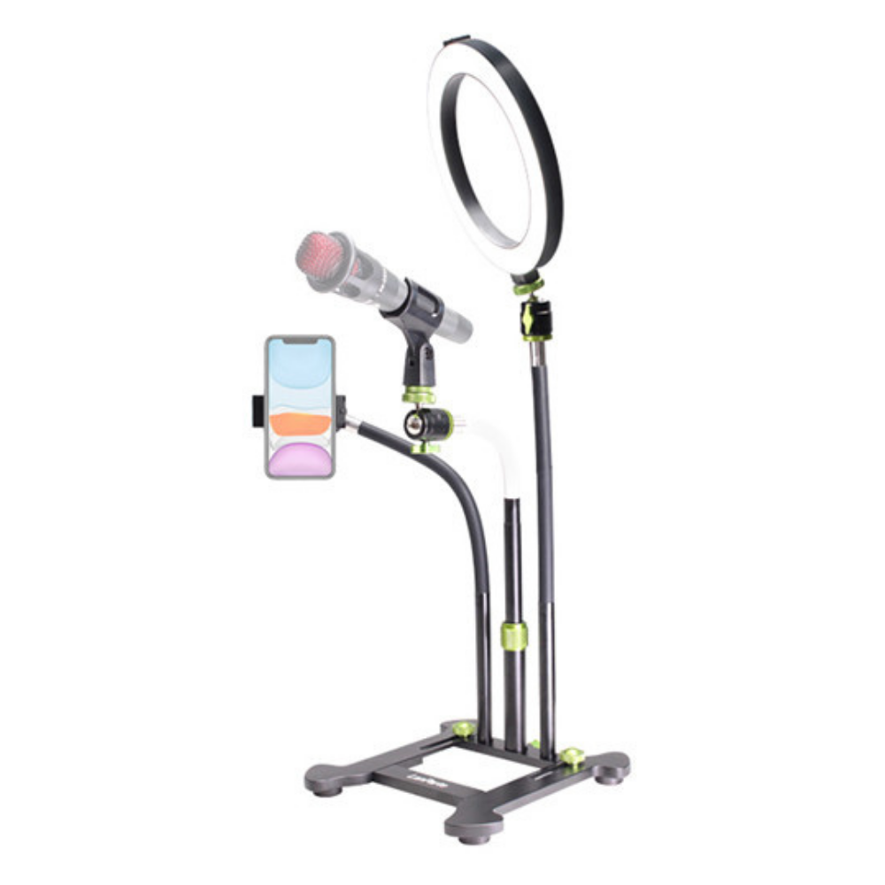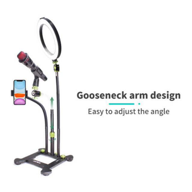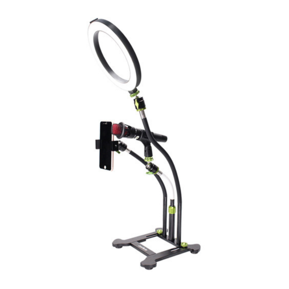 Graba vlogs, retransmisiones en directo y otros vídeos desde cualquier superficie plana con el soporte para smartphone Livestream Desktop de LanParte. El soporte de mesa cuenta con tres brazos ajustables con cuello de cisne, que terminan en un soporte para micrófono, una pinza para el smartphone y un accesorio circular para luz LED, todo ello con cuellos articulados…