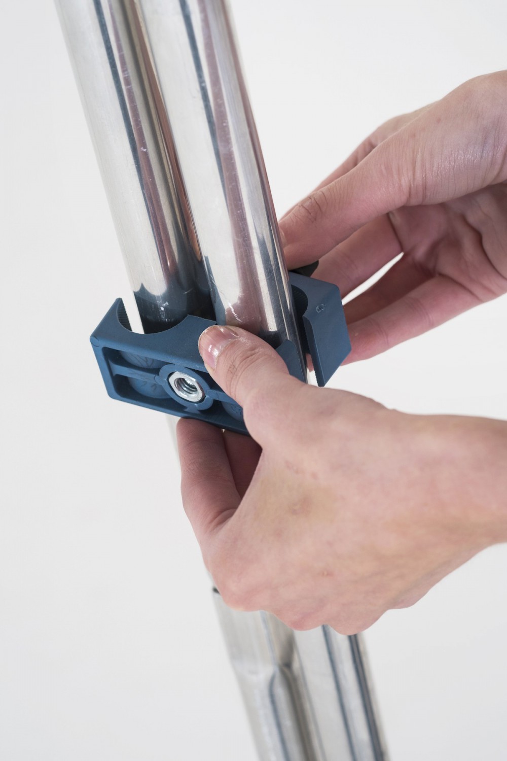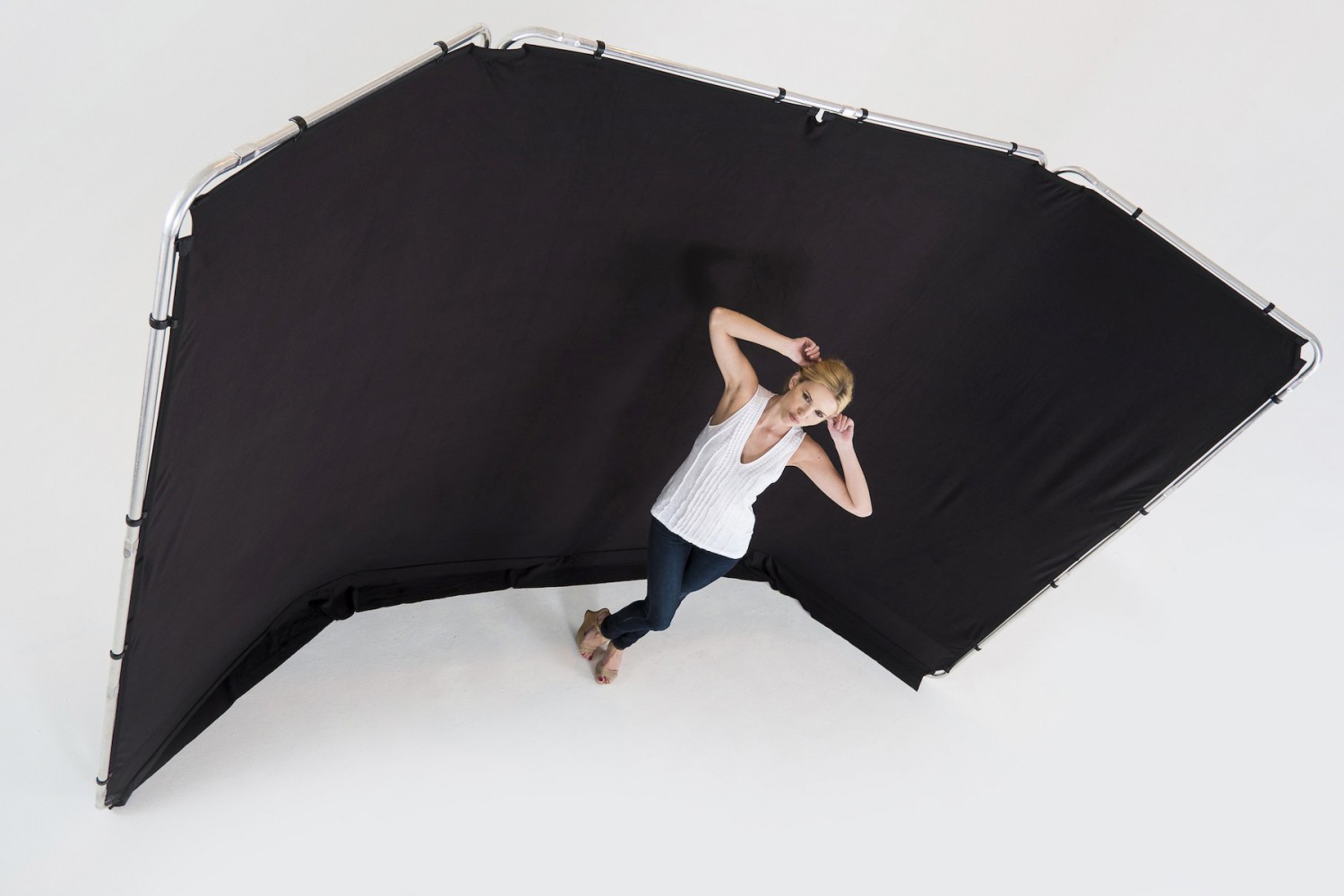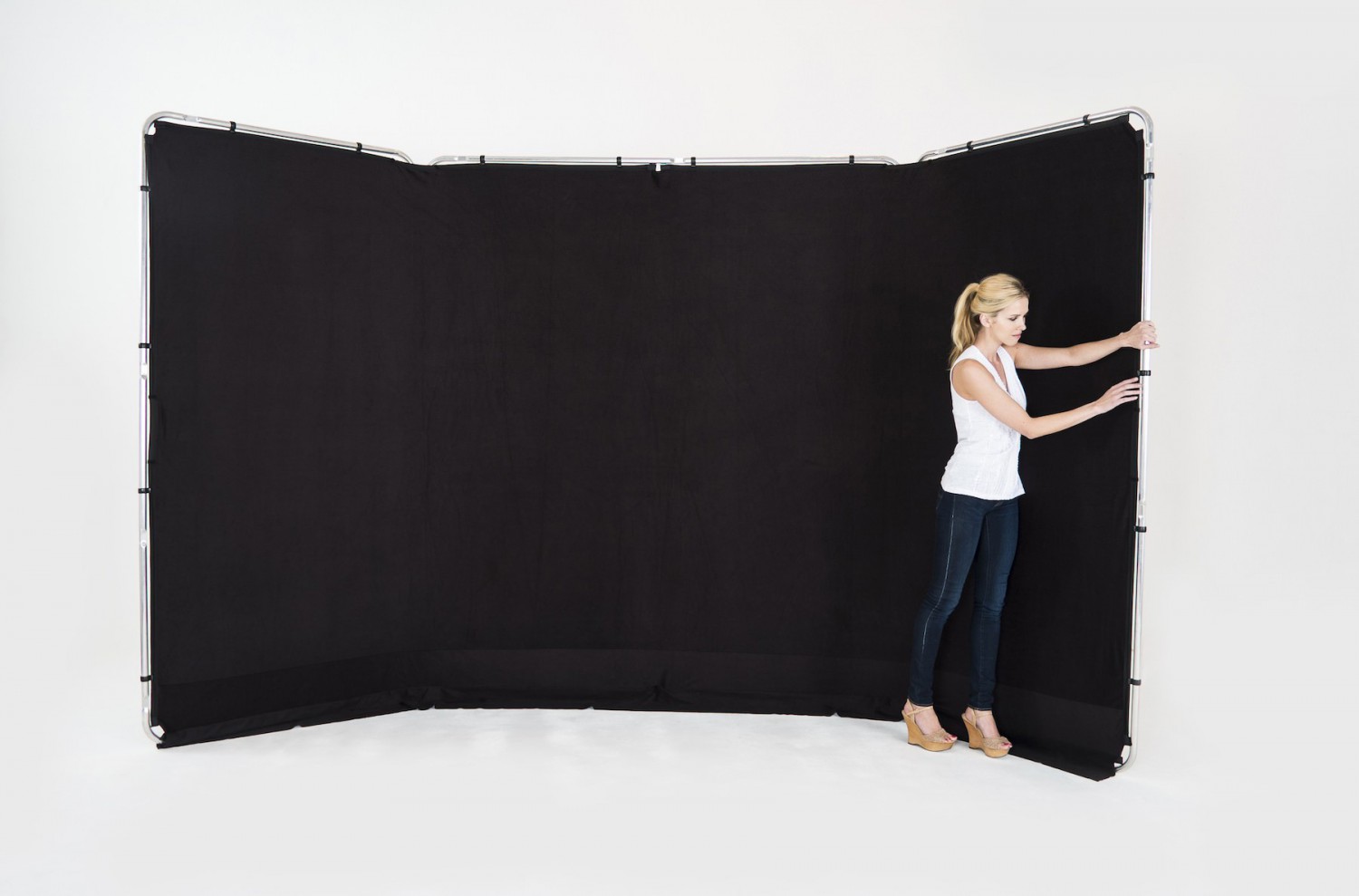 Fondo panorámico con tres piezas de aluminio que te permiten fijarlo sin necesidad de soportes ni trípodes.