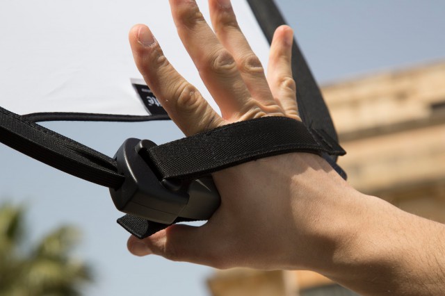 Gran reflector TriGrip para tomas que requieren iluminar, por ejemplo, todo el cuerpo mediante luz reflejada. En lugar de la forma circular de los difusores estándar, el TriGrip utiliza un diseño triangular que proporciona una estructura mucho más resistente y estable. Otra de sus ventajas es el mango ergonómico con correa de sujeción.