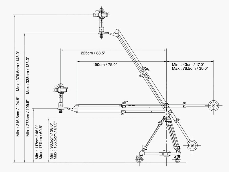 Gracias a su diseño telescópico, podrás adaptar el brazo de la cámara muy rápidamente a la toma deseada. Aflojando unos pocos tornillos, puede desplazar el brazo hacia delante o hacia atrás y conseguir así un equilibrio perfecto incluso en localizaciones donde no hay suficiente espacio para el operador. Gracias a este diseño, el brazo ha adquirido la variabilidad necesaria para casi cualquier toma en interiores y exteriores. Todo el brazo se puede colocar fácilmente sobre patas fijas (p. ej., T102B), una base con ruedas (p. ej., DL-8B) o un sistema de rieles (p. ej., TR-320), lo que contribuye aún más a la versatilidad de este brazo.