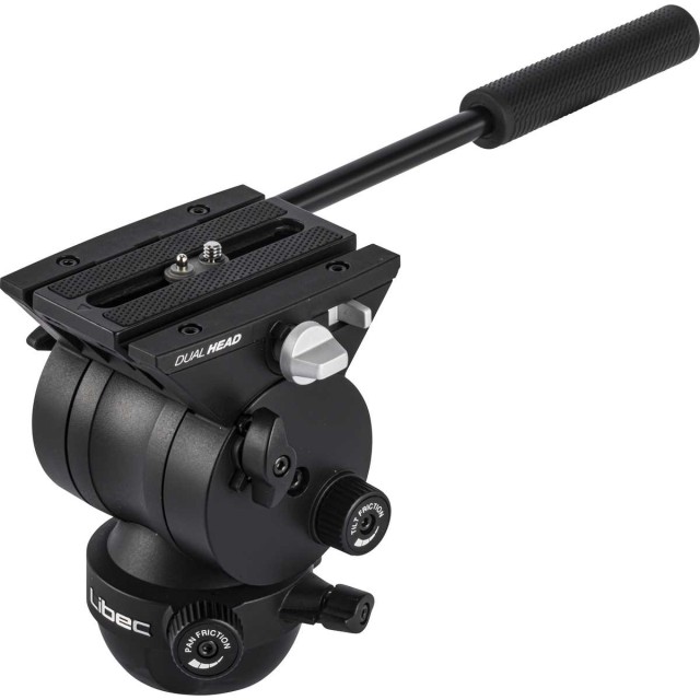Cabezal de vídeo fluido de 75 mm del sistema Libec TH con empuñadura giratoria y capacidad de carga de 5 kg. El «cabezal dual» es compatible con platinas de 75 mm y bases planas de trípodes fotográficos, sliders, etc. La placa deslizante de fijación rápida es compatible con los modelos Libec 650EX, TH-M, TH-X, TH-Z, las series NX y HS, y otros (Manfrotto y Sachtler). A la venta a partir de abril de 2024.