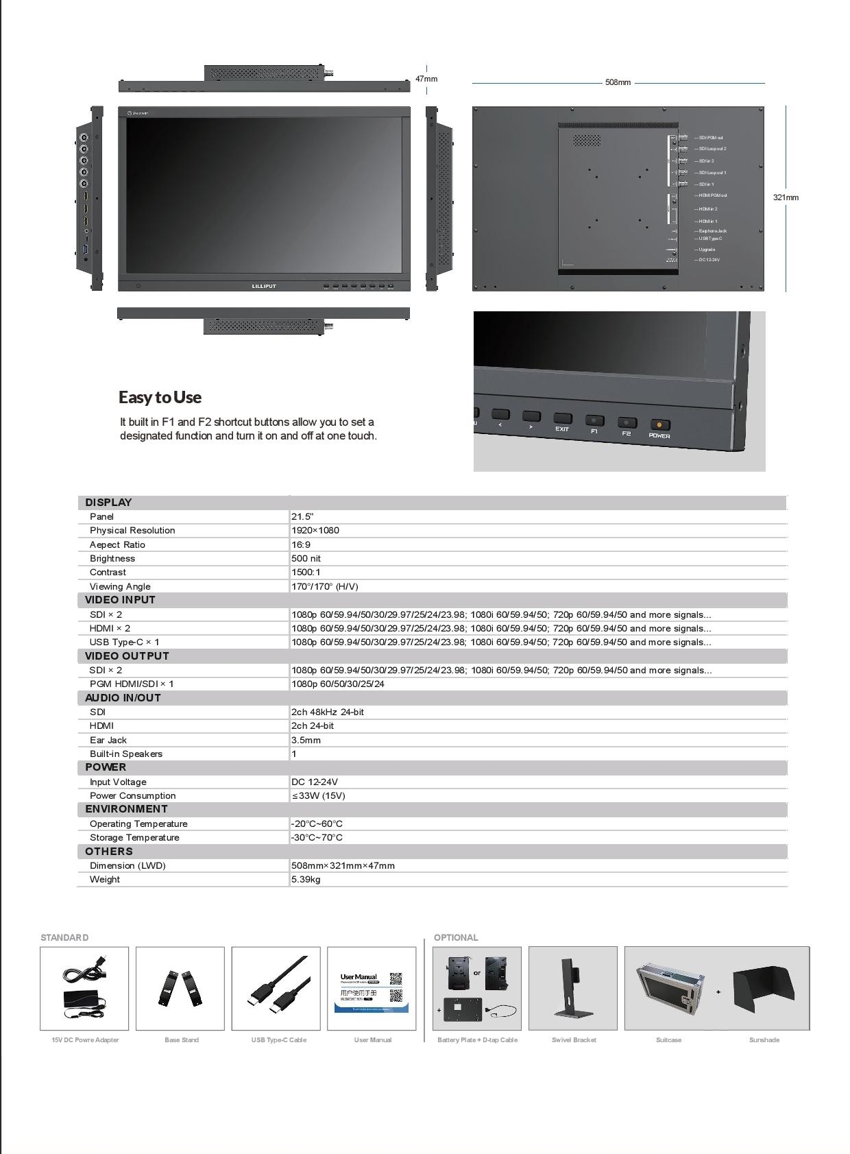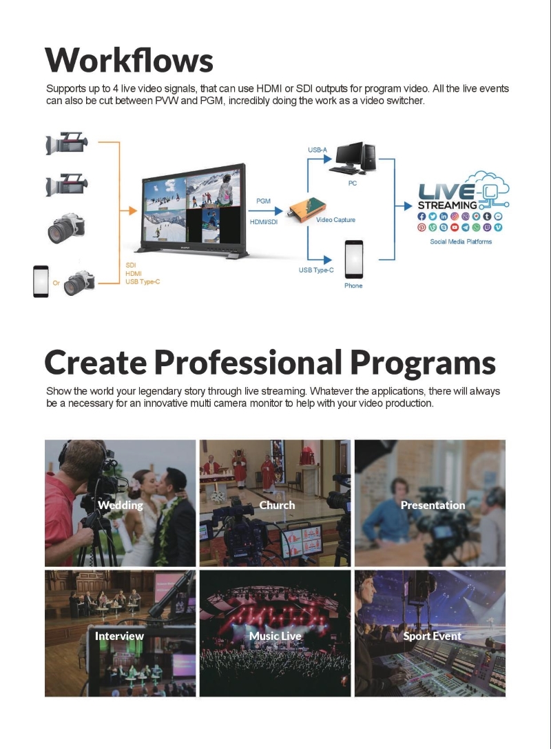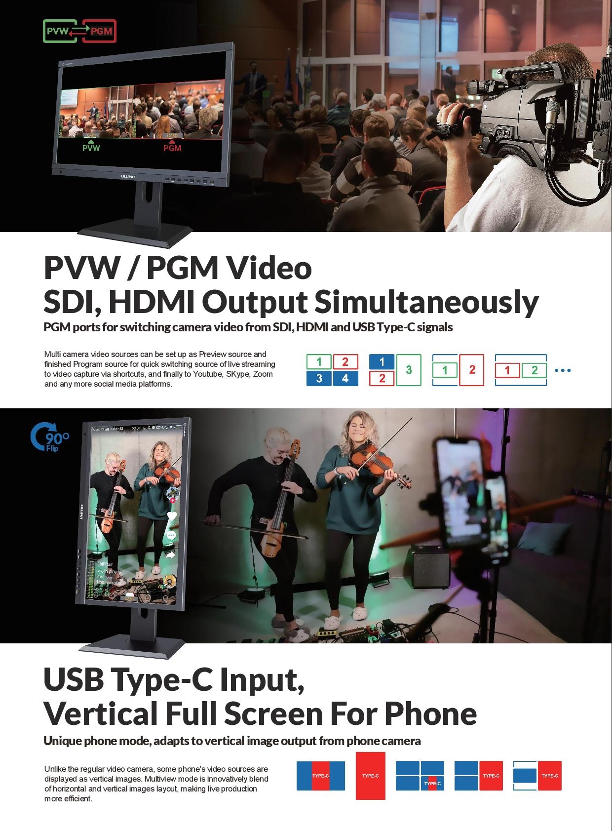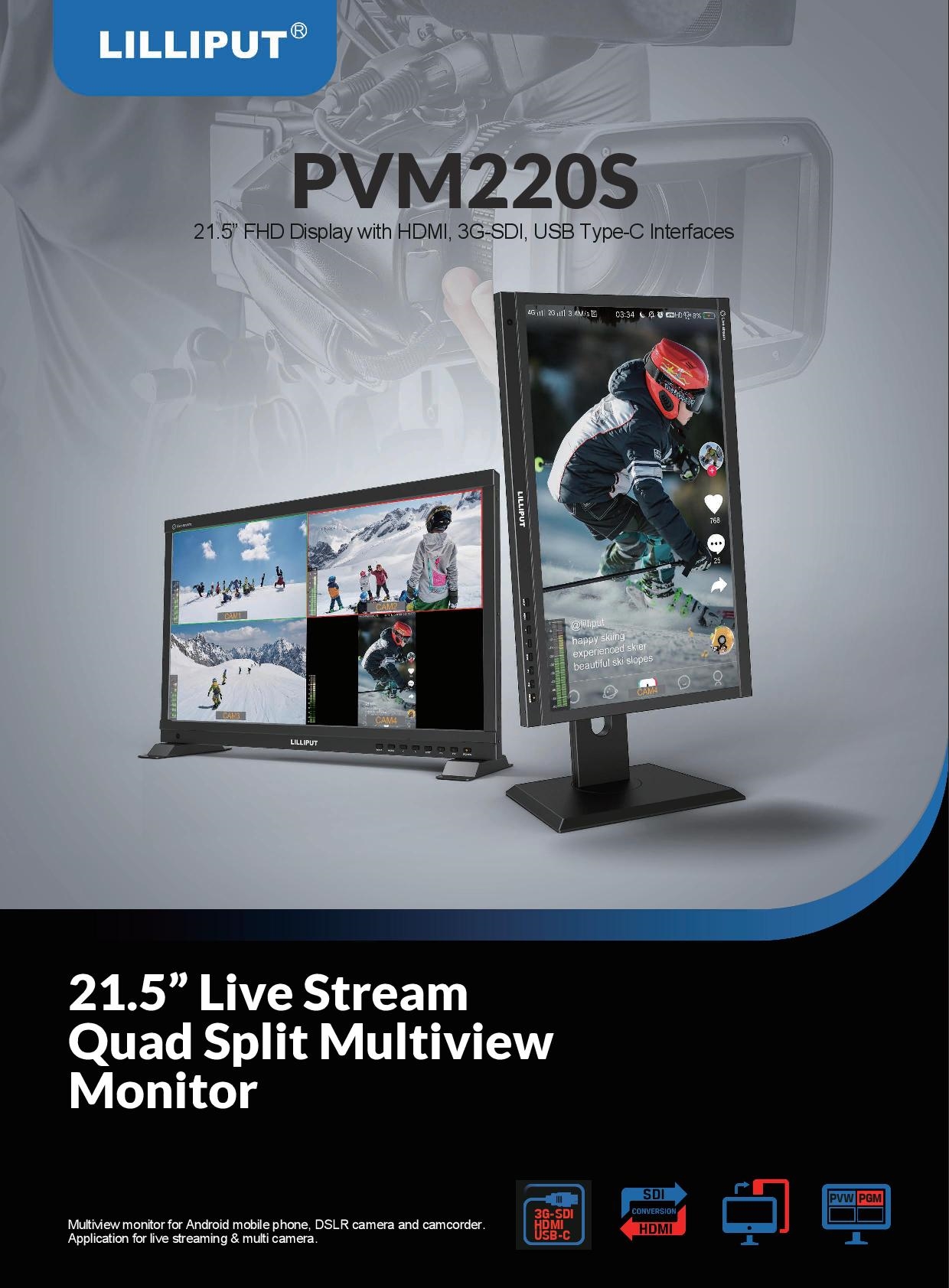 El monitor de emisión PVM220S de 21,5" con 3G-SDI/HDMI de Lilliput cuenta con una división de pantalla en cuatro partes, salida de vista previa y de programa, y modos de visualización horizontal y vertical, ideales para contenidos de redes sociales. Este monitor, con una resolución de 1920 x 1080 píxeles, ofrece entradas de audio 3G-SDI, HDMI y USB tipo C, así como salidas 3G-SDI y HDMI. Ofrece un brillo de 500 cd/m², un contraste de 1500:1, monitorización de audio de dos canales en pantalla y varias herramientas de visualización para crear una imagen precisa.