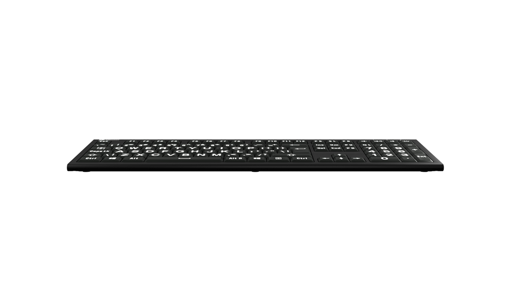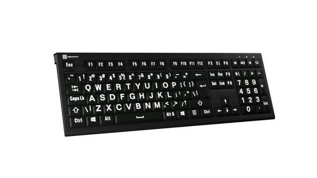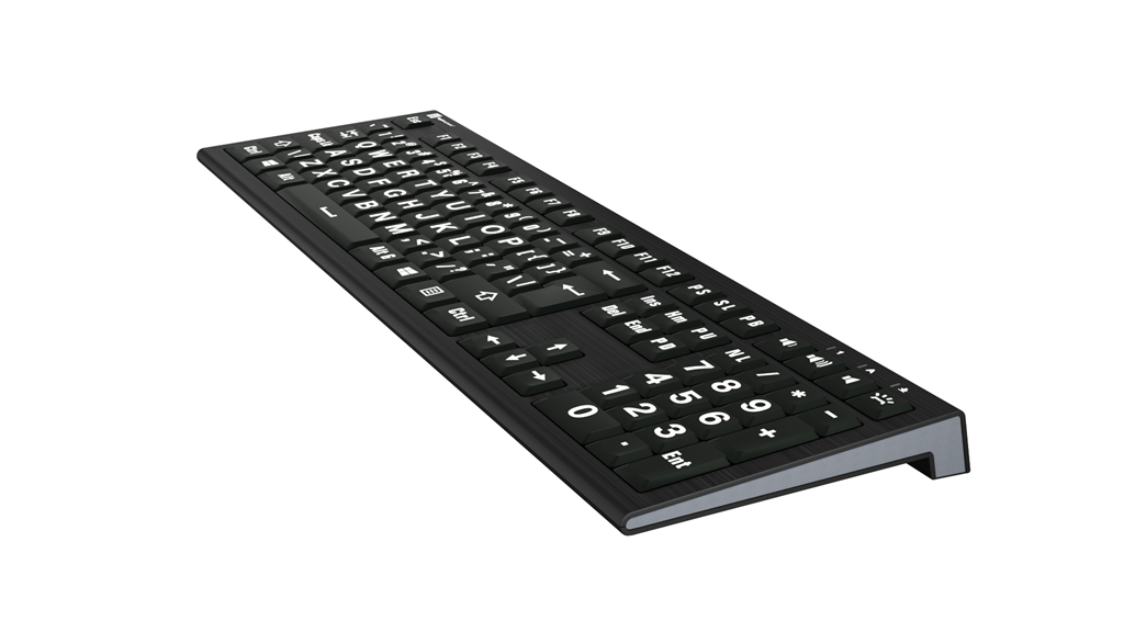 Nuestros teclados Largeprint están diseñados para satisfacer las necesidades individuales y están disponibles en diversas combinaciones de colores, de modo que los usuarios puedan elegir la combinación que mejor se adapte a sus preferencias. Este teclado es blanco sobre negro.