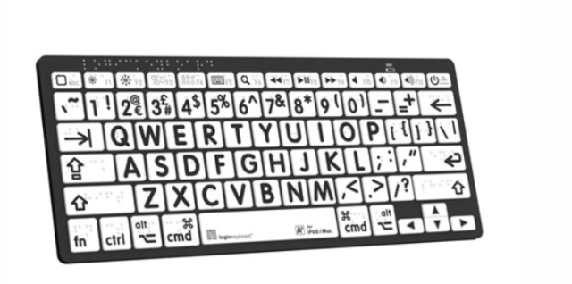 El teclado auxiliar Logickeyboard Braille/Large Print Black on White para Mac es un teclado inalámbrico compacto diseñado teniendo en cuenta la accesibilidad. Gracias a sus teclas de gran tamaño combinadas con caracteres en braille en relieve, su conexión por Bluetooth y su diseño ligero, ofrece a los usuarios de macOS y iPadOS una experiencia de escritura inclusiva y fácil de usar.