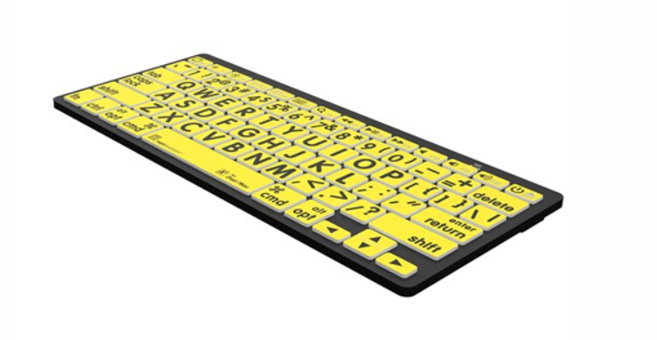 El teclado Logickeyboard XLPrint Bluetooth, en color negro sobre fondo amarillo, es un teclado con caracteres grandes diseñado para usuarios con discapacidad visual. Gracias a sus teclas llamativas en negro sobre fondo amarillo, la conexión inalámbrica por Bluetooth y las teclas táctiles con mecanismo de tijera, ofrece a los usuarios de macOS y iPadOS una experiencia de escritura cómoda y eficaz.