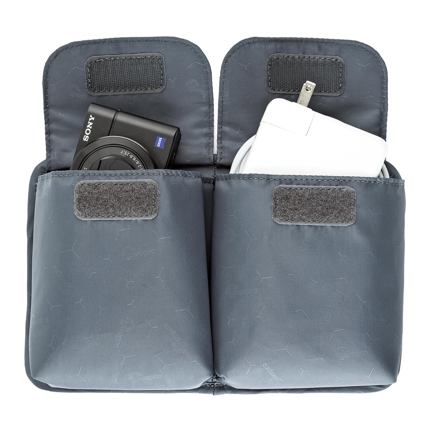 La funda grande y gris Lowepro GearUp Pouch está diseñada para guardar y proteger los accesorios de la cámara y los dispositivos.