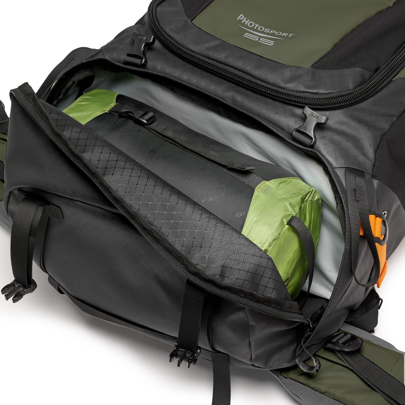 La mochila PhotoSport PRO 70L AW IV está fabricada con un 86 % de materiales reciclados, incluyendo nailon Oxford 420D 100 % reciclado y nailon Diamond Ripstop 420D con superficie de carbonato, y cuenta además con la funda All Weather AW Cover™, que protege tu equipo de la lluvia, la nieve y el polvo. Esta mochila ligera, ergonómica y ecológica es ideal para fotógrafos que buscan protección profesional y comodidad en entornos al aire libre remotos.