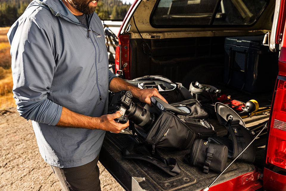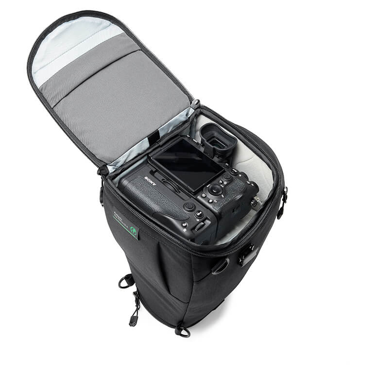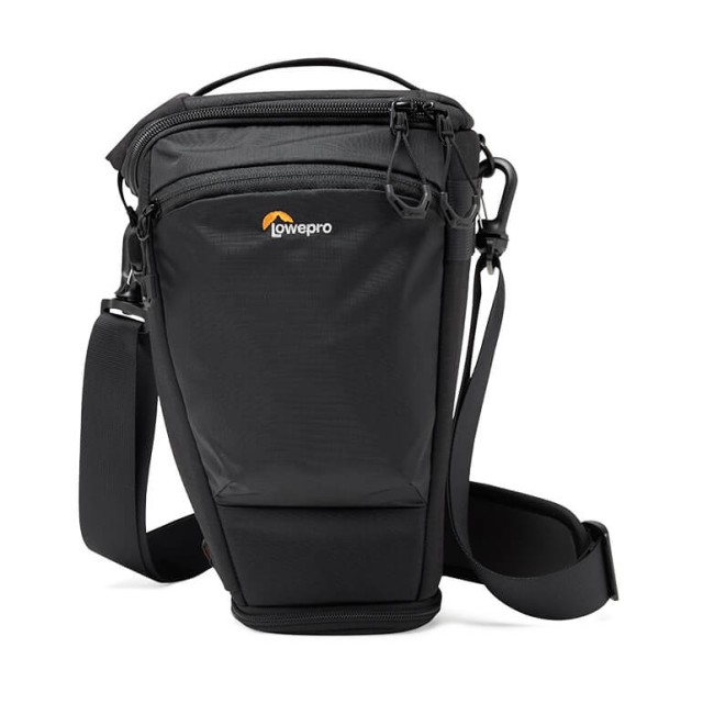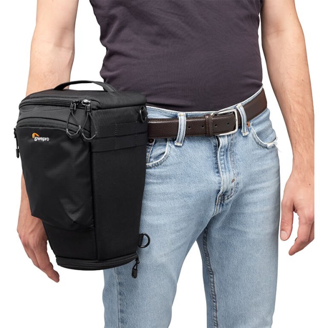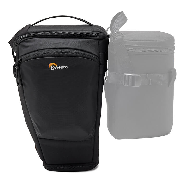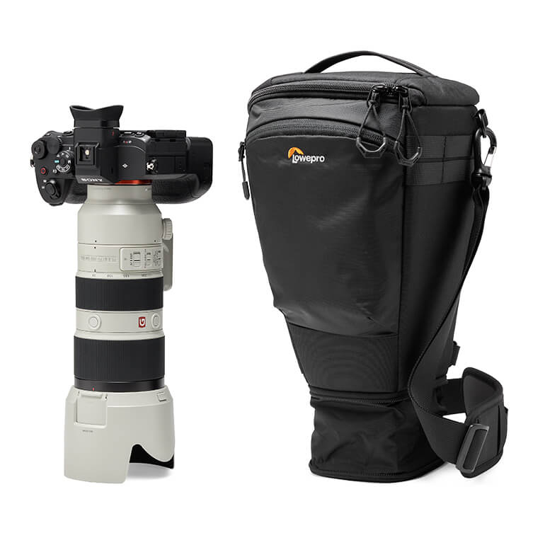 TopLoader es ideal para cuerpos de cámara de formato completo con empuñadura y objetivos de hasta 70-200 mm F2,8, con una extensión para el parasol. Compatible con los accesorios SlipLock, como las fundas para objetivos