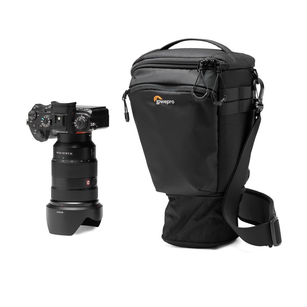 • Diseño estilizado con carga superior para cámaras DSLR de formato completo con objetivos de hasta 70-200 mm F2.8