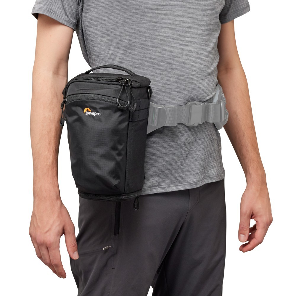 Esta bolsa delgada de carga superior ofrece opciones de transporte versátiles. Utilice las correas principales y estabilizadoras para llevarla al hombro de forma estándar, cámbiela a la posición de pecho para un acceso rápido, o fíjela al cinturón ProTactic Utility Belt III, a cinturones ProTactic compatibles o a un cinturón de pantalón estándar de 38 mm. La bolsa es compatible con el sistema SlipLock™ para fundas de objetivos adicionales, lo que permite a los fotógrafos ampliar su sistema incluso cuando están de viaje.