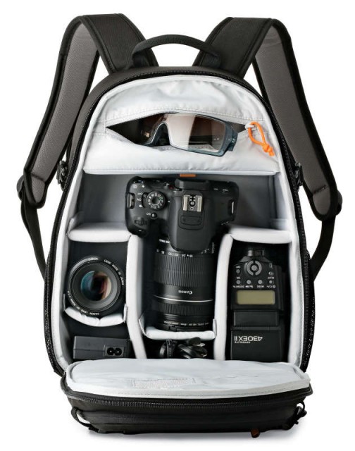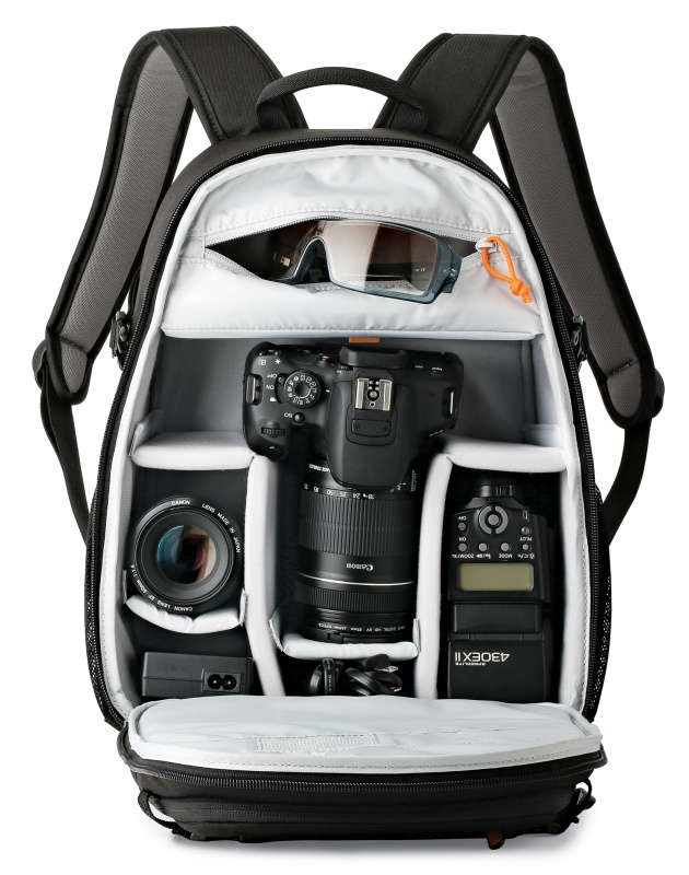 El espacioso compartimento principal con doble cremallera cuenta con dos separadores acolchados grandes y dos pequeños, ajustables, que protegen tu cámara, dos objetivos, el flash y otros accesorios, mientras que el bolsillo interior con cremallera separa los cables y las baterías de repuesto.