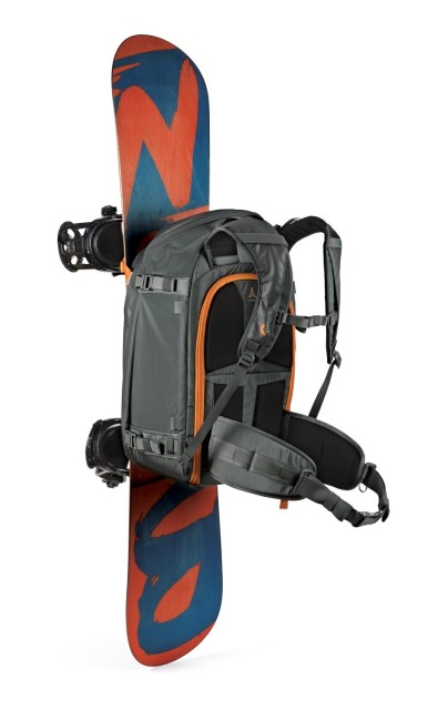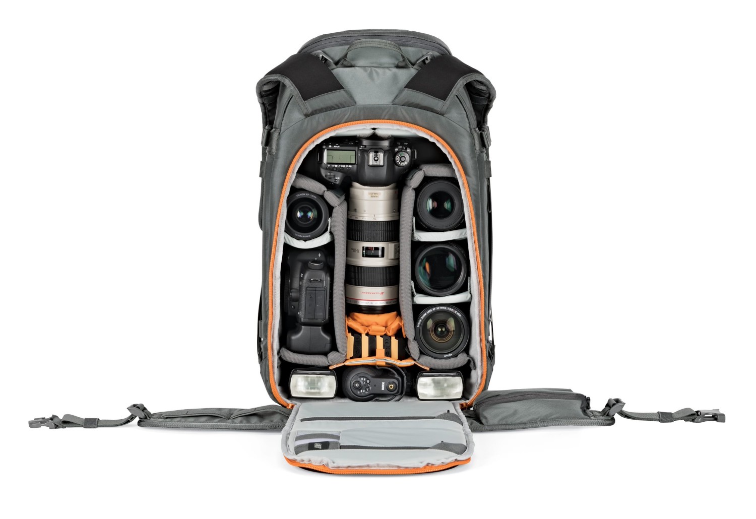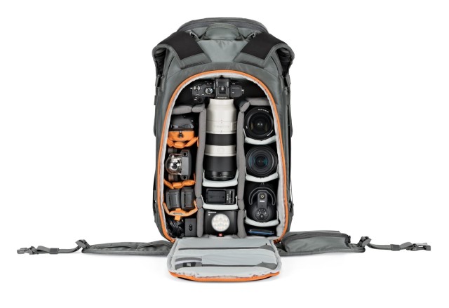 Su espacioso interior tiene capacidad para una cámara réflex profesional o una cámara sin espejo con un objetivo de 70–200 mm f/2,8 montado, junto con hasta 8 objetivos o accesorios adicionales, un cuerpo de cámara de repuesto y equipos como cámaras de acción o drones. Gracias al acceso tanto desde la parte superior como desde el lateral de la mochila, podrás acceder rápidamente a tu equipo sin tener que vaciarla por completo. El bolsillo delantero ampliable es ideal para guardar material de escalada, como una pala, una sonda o ropa de recambio.