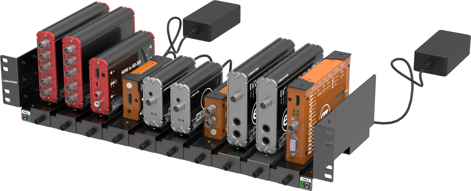 El Rackmount es quizás uno de los productos más sencillos de LUMANTEK. Sin embargo, es el único producto que te puede ahorrar todos los cables y el desorden que provocan las múltiples conexiones de los convertidores. Además, solo necesitas 2 adaptadores de corriente en lugar de usar uno por cada convertidor.
