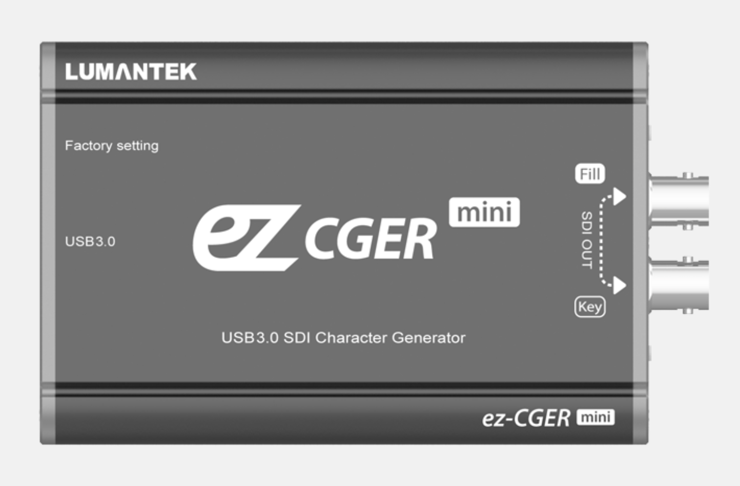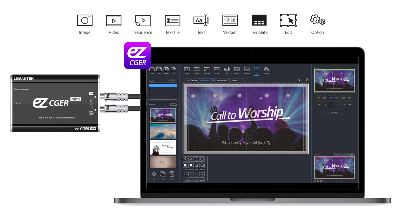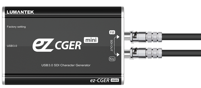 Gracias al tamaño reducido del convertidor y a su sencilla conexión a través de USB 3.0, el ez-CGER mini genera señales Fill & Key en formato SDI. ¡Conéctalo a tu propio conmutador de vídeo y retransmite tu vídeo en directo con CG! Con el software especializado ez-CGER de LUMANTEK, puedes insertar imágenes, vídeos, archivos de texto y mucho más.