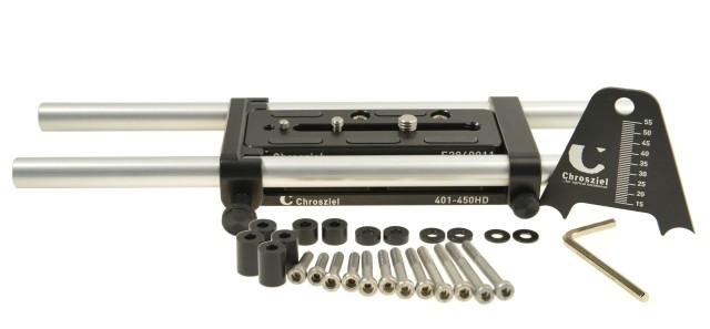 LWS - Light Weight Support 15 HD Allround, con varillas de Ø 15 mm, longitud 310 mm, guía doble de varillas y abrazadera, ajustable para todas las cámaras con una altura óptica de entre 26,5 y 72,5 mm (distancia entre el centro del objetivo y la parte inferior de la cámara). El suministro incluye arandelas distanciadoras (pares) de 1, 2, 4, 8 y 2 x 16 mm, un juego de tornillos, una tabla con las alturas de la cámara y una llave Allen. (Como alternativa, se pueden utilizar todas las plataformas para cámaras Chrosziel de la serie 401-4xx.)