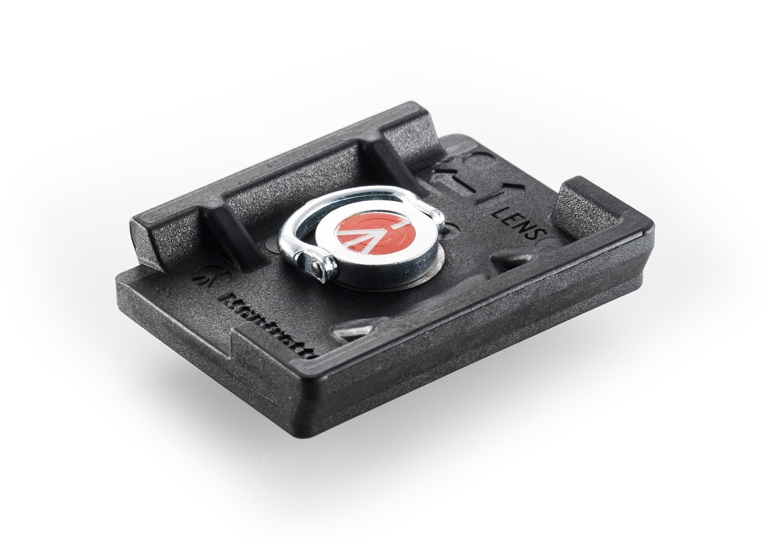 Placa de fijación rápida ligera Manfrotto 200LT-PL: placa ultraligera de tecnopolímero y fibra de vidrio con un peso de 31 g, compatible con RC2/Q2, capacidad de carga de 4 kg, superficie de goma de alta adherencia y cierre de seguridad con forma de logotipo para una fijación rápida y segura de la cámara.