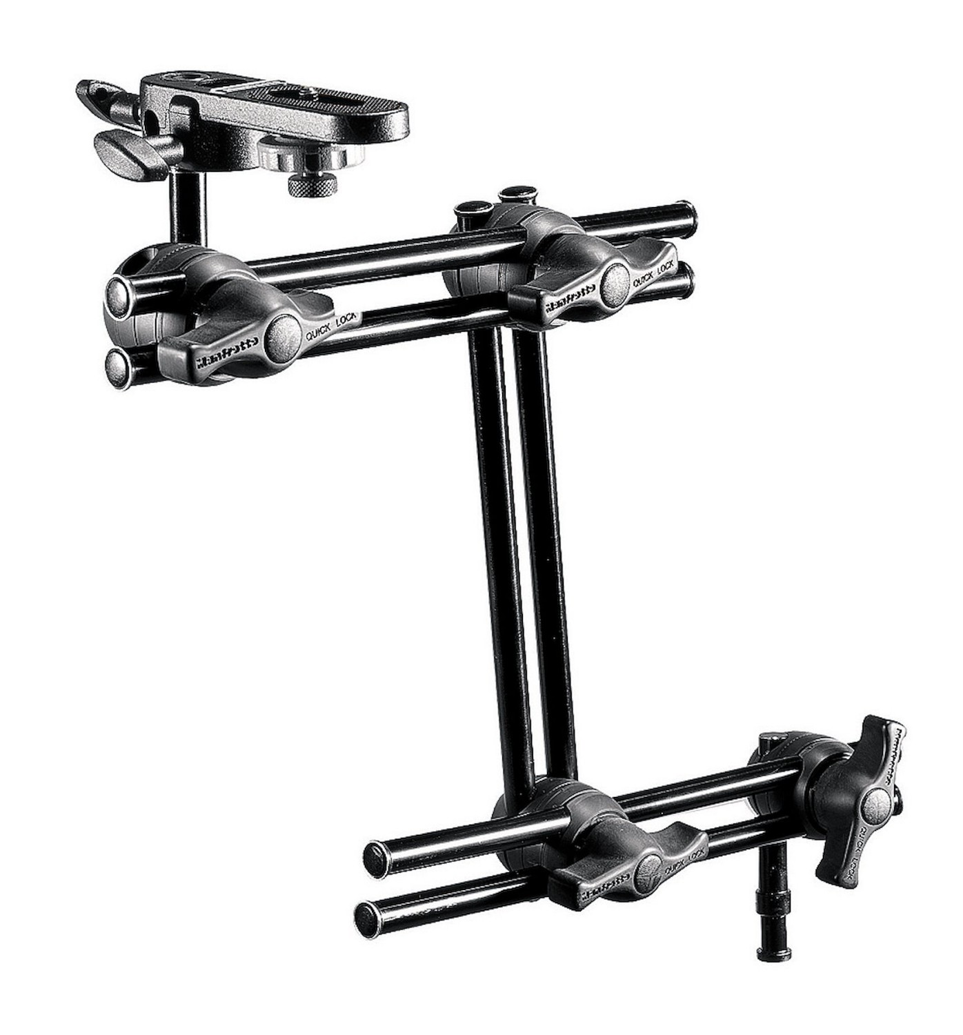 El sistema de bloqueo rápido garantiza un ajuste rápido y seguro, mientras que la fijación inferior reforzada aumenta la estabilidad y la compatibilidad. El pivote inferior combina una parte hexagonal antideslizante, ideal para su uso con los sistemas Super Clamp, con un adaptador universal para trípodes, abrazaderas y accesorios. El modelo 396B-3, que se suministra con un soporte para cámara en la fijación superior, es ideal para sujetar cámaras, luces, monitores y otros equipos en el estudio o sobre el terreno.
