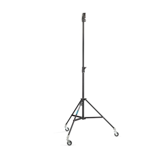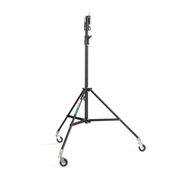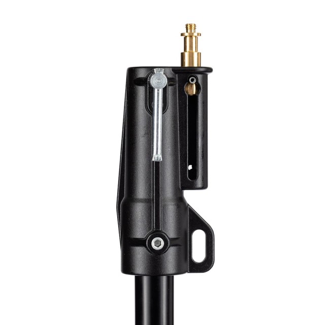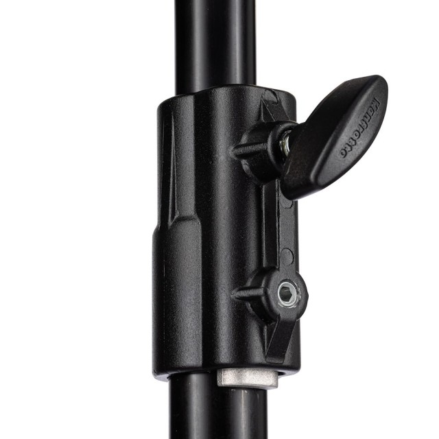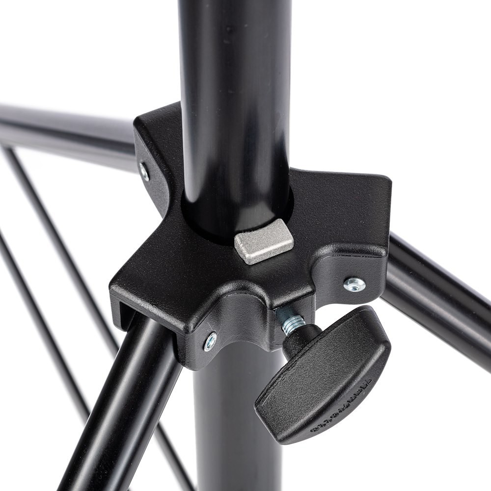 Incluye una pata niveladora que permite un uso estable en superficies irregulares, incluyendo escaleras o pendientes. El trípode soporta una carga máxima de 15 kg y se puede extender hasta 212 cm, mientras que su longitud cuando está plegado es de 112 cm, lo que facilita su almacenamiento y transporte. Las dos opciones de fijación en la parte superior —hembra de 1 1/8" (28 mm) y macho de 5/8" (16 mm)— garantizan la compatibilidad con una amplia gama de cabezales de iluminación y accesorios.