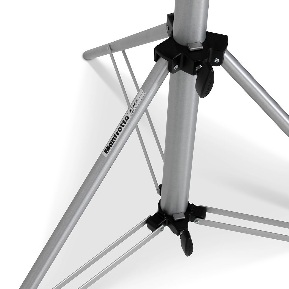 El soporte Manfrotto Base Stand, diseñado para ofrecer un apoyo fiable por encima de la cabeza y en posición vertical en entornos profesionales, destaca como base específica para los Autopoles. Utiliza un tubo de 45 mm de diámetro para una integración fluida y una sujeción segura, mientras que sus robustas patas, con un tubo de 22 mm de diámetro, proporcionan una base amplia y estable con una envergadura de casi 50 pulgadas (1,3 m), lo que evita que se vuelque bajo carga. Este soporte versátil está fabricado en aluminio resistente pero ligero, con un peso de solo 1,21 kg, y se puede plegar hasta una longitud transportable de 86 cm para facilitar su transporte, lo que lo convierte en un accesorio indispensable para fotógrafos, camarógrafos y escenógrafos que necesitan montar rápidamente un equipo estable sin comprometer la eficiencia espacial. Su diseño prioriza la seguridad y el rendimiento, admite diversas configuraciones de iluminación, fondos o rigging con un tiempo de montaje mínimo, y su estructura totalmente metálica garantiza una larga vida útil en condiciones de uso exigentes, tanto en estudio como sobre el terreno: convierte cualquier Autopole en un sistema vertical u horizontal firme.